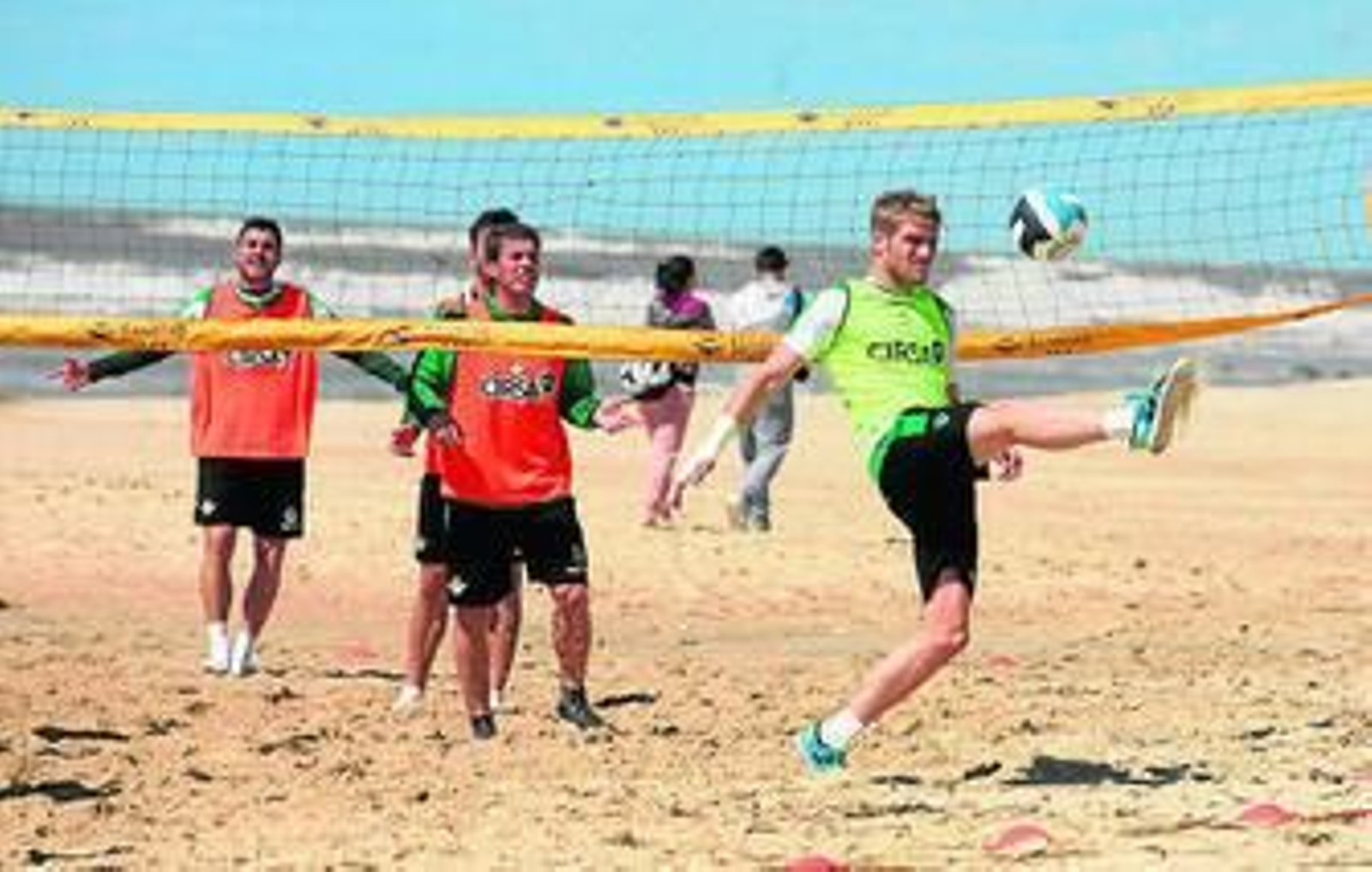 La jornada de ayer mezcló convivencia con ejercicios sobre la arena. Tras el calentamiento con una carrera por la playa y ejercicios compensatorios, el preparador físico, David Gómez, preparó una serie de juegos, en los que la plantilla se dividió en dos grupos que competían el uno con el otro y que provocaron las primeras risas de la mañana. Posteriormente, el equipo se dividió en cuatro equipos, que disputaron partidillos de voleibol y fútbol con porterías pequeñas, en los que de nuevo surgieron los piques sanos que se pretenden con estos ejercicios.