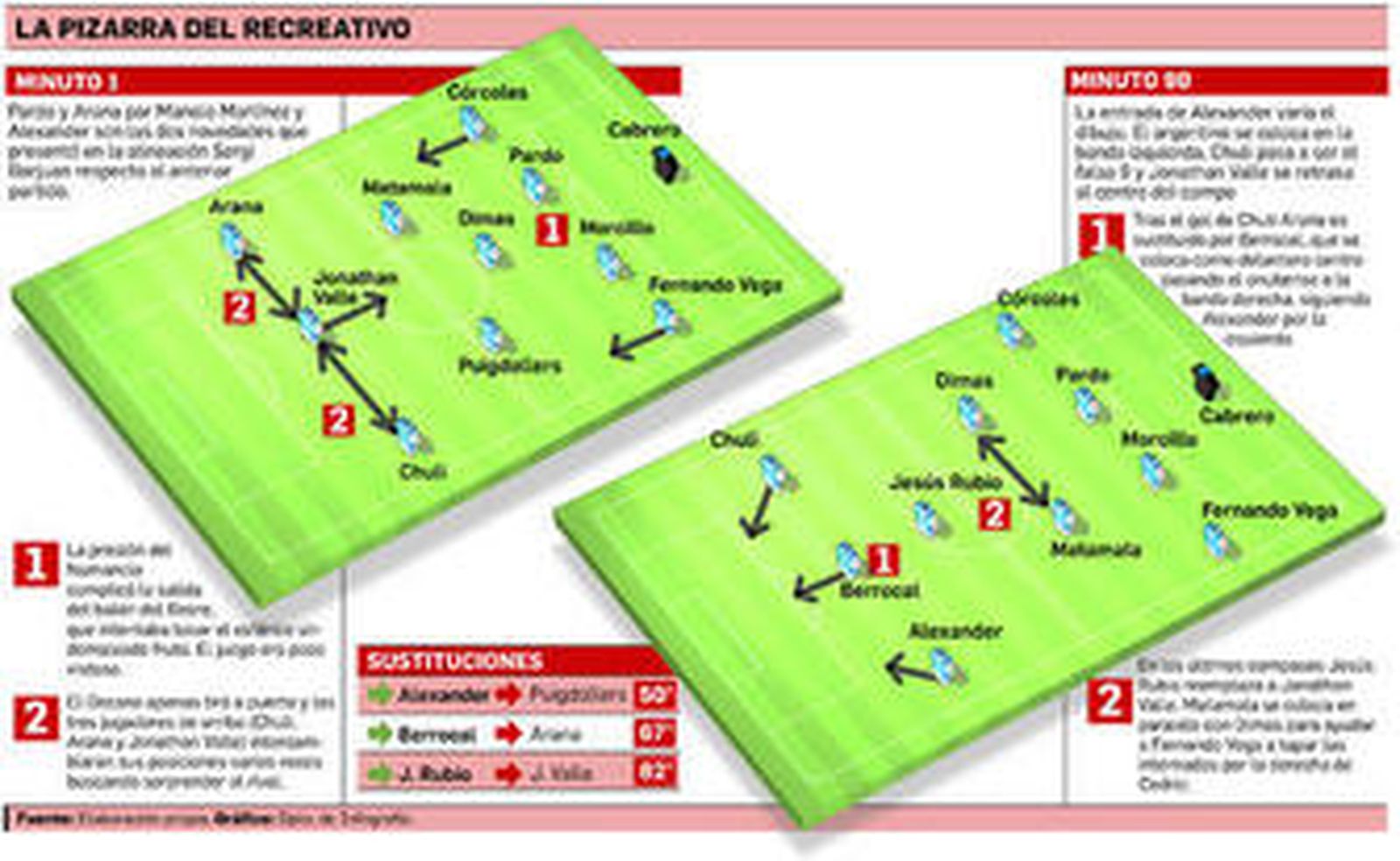 Ayer una de las novedades fue la titularidad de Arana en la banda derecha. El sevillano dio muestras de su potencial y protagonizó algunas internadas peligrosas. De hecho en una de ellas nació el primer tanto del Recre, cuando intentó hacerle una vaselina a Herrerín.
