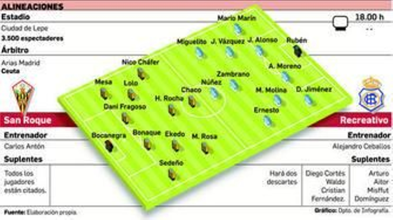 Dejando a un lado la propia situación clasificatoria del San Roque, el principal problema para su entrenador será el elevado número de bajas con las que cuenta para preparar el partido. Antón no podrá contar por sanción con Fran Lepe, ni con Manu Ramírez, cedido por el Recreativo en el equipo lepero, ni con los lesionados Marc Fraile y Juanma. Además, tendrá que esperar hasta minutos antes del comienzo del encuentro para saber si la evolución de los problemas físicos que han provocado que otros futbolistas de la plantilla lepera como Pedro Baquero, Isuardi, Sedeño o Pablo Oliveira -este último ya entró la semana pasada en la convocatoria- les van a permitir estar hoy a su disposición. El que sí es alta segura para recibir hoy al Decano es Marco Rosa, ausente por sanción en el último partido.