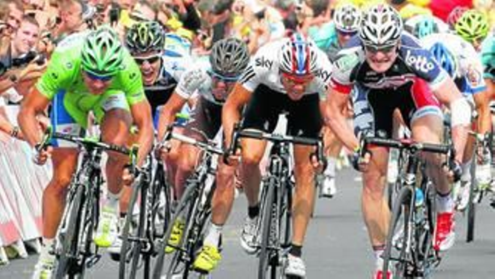 Greipel, a punto de cumplir 30 años, empató a tres con Sagan en una llegada en la que El gorila estuvo enorme ante la oposición del ciclista eslovaco, a quien superó por un tubular. Un duelo a alta velocidad en el que el noruego Edvald Boasson Hagen (Sky) fue lanzado por el propio líder, Bradley Wiggins, pero se tuvo que conformar con la tercera plaza.