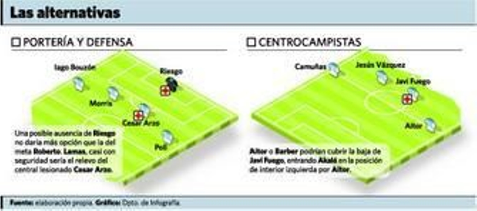 Es evidente que si Asier Riesgo no pudiera jugar -lo normal es que sí lo haga- su puesto sería ocupado por Roberto; la vacante de Javi Fuego podría ser para Aitor, para Barber o incluso para César Arzo, si está en condiciones de jugar; por último si es este quien no puede alinearse ante el Atlético, Zambrano dudaría para el centro de la zaga entre Beto, recuperado de su lesión, pero sin el ritmo de trabajo de sus compañeros, y Lamas.