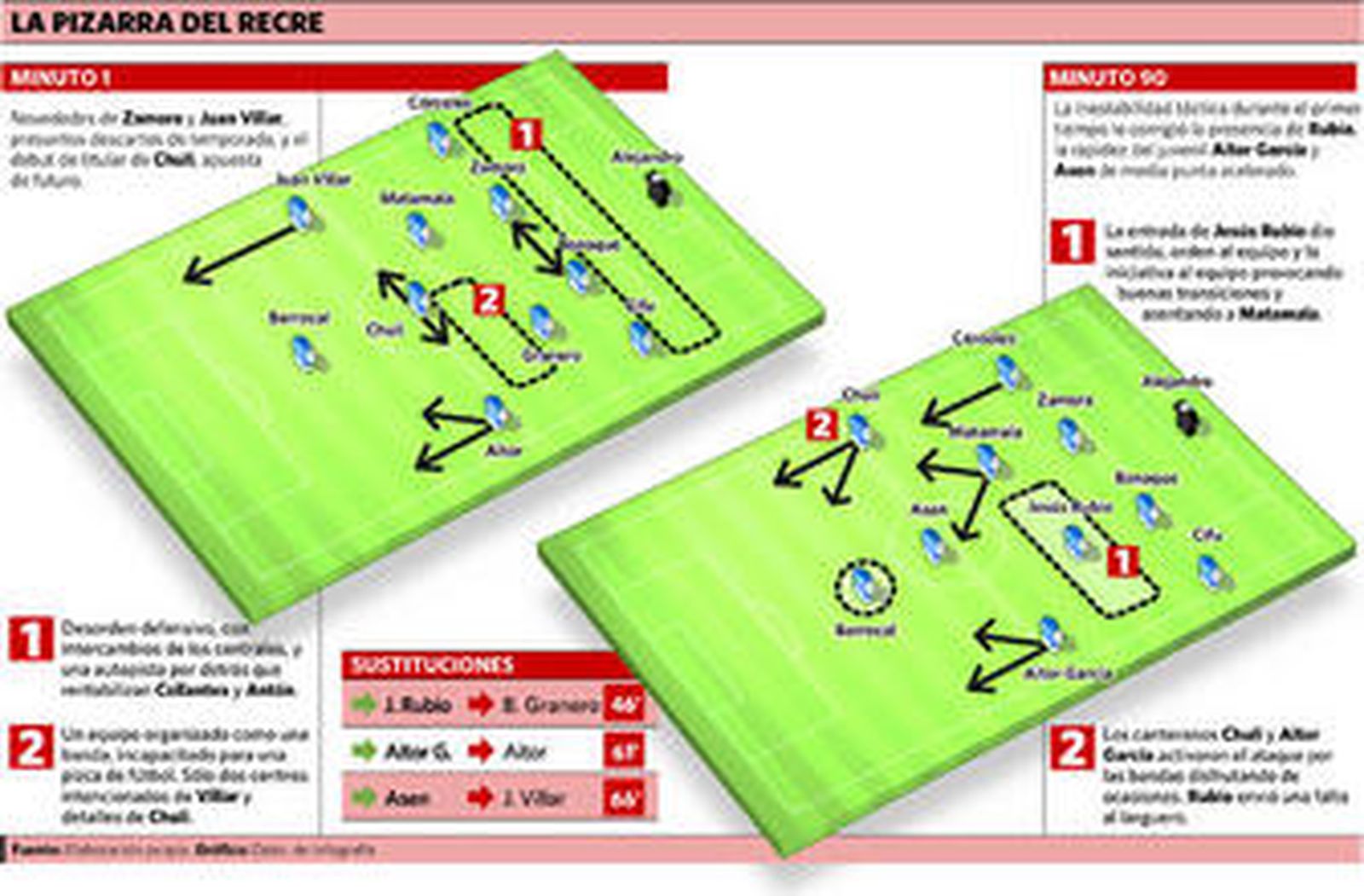 Inestabilidad defensiva y desorden táctico recreativista en el primer tiempo para lucirse el descendido Cartagena · La entrada de Rubio dio sentido al equipo y la presencia de Aitor García activó el ataque
