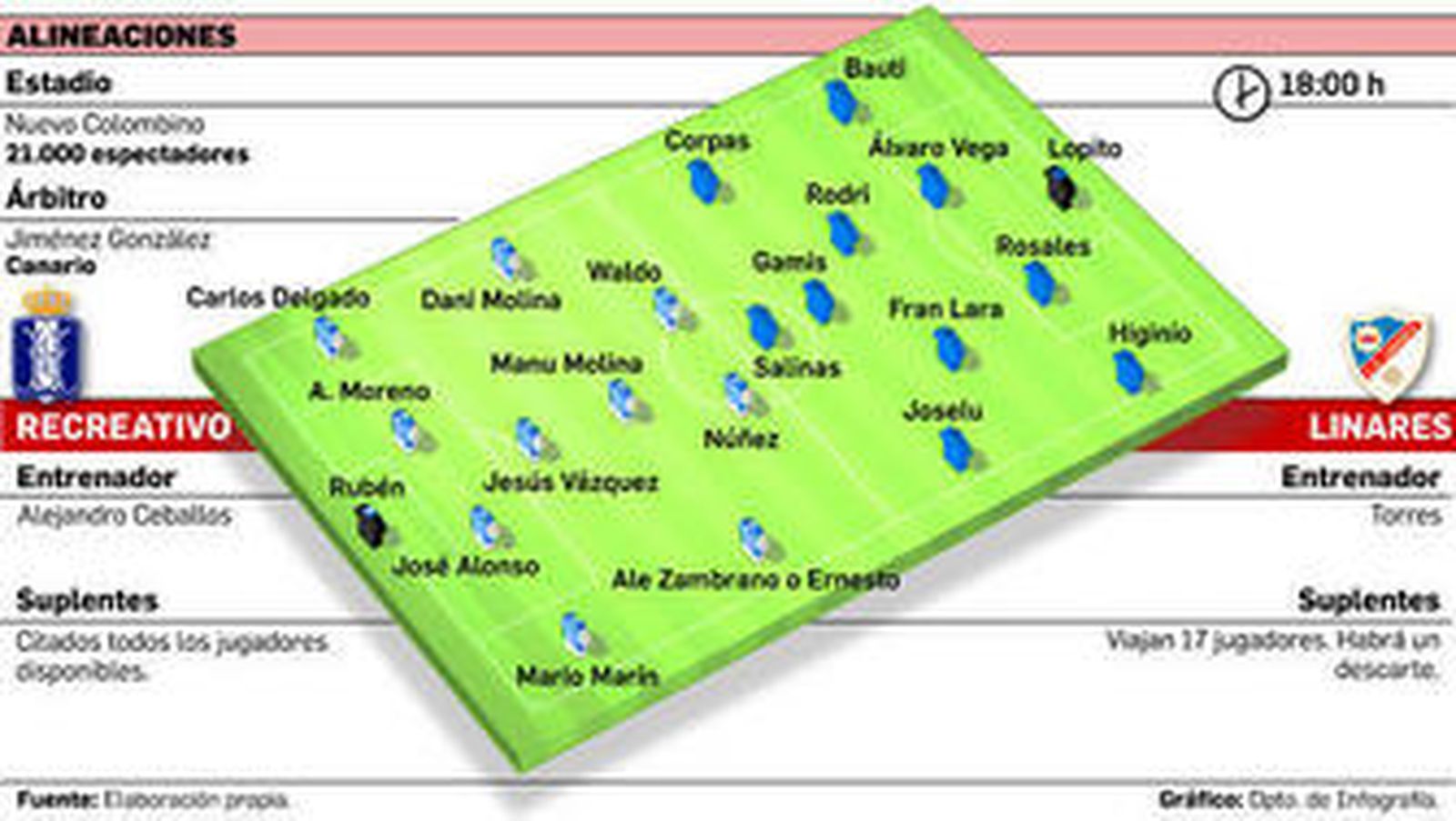 Para un partido tan determinante, Alejandro Ceballos cuenta con los problemas que le han perseguido durante toda la temporada. No tiene lateral izquierdo. Además Diego Jiménez está prácticamente descartado para el choque por unas molestias en la rodilla. Tampoco tiene referencia ofensiva por la sanción de Rubén Mesa y la lesión de Arthuro. Tras la experiencia en Lepe de la semana pasada, el de Gines hará una modificación. Espera un choque de control, posesión y mucha cabeza contra el Linares. Por ello durante la semana probó con una variante que le permita tener una mayor presencia en el centro del campo. Así también anularía el planteamiento jiennense. Los de Torres en las jornadas precedentes colocaron más futbolistas por dentro. Dani Molina regresará al once inicial después de cumplir su sanción. Ante la falta de recursos ofensivos, parece probable que como en otras ocasiones Ceballos apuesta por cuatro centrocampistas con uno de ellos algo más escorado en banda y arriba se repartan las funciones del ataque Waldo y Antonio Núñez. La alternativa es la entrada de Ernesto, lo que provocaría la salida de Ale Zambrano del once. El cuarteto defensivo estará formado por Mario Marín, José Alonso, Álvaro Moreno y Carlos Delgado. El preparador convoca a todos sus hombres disponibles.
