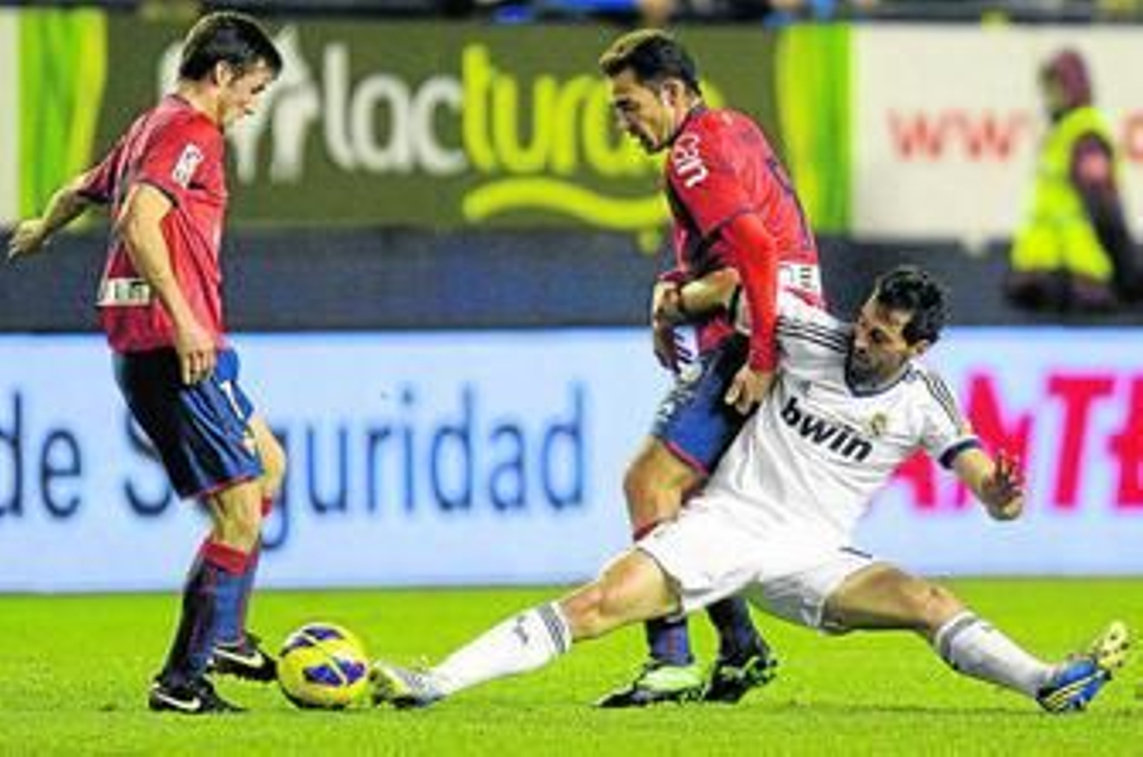 Osasuna: Andrés Fernández; Marc Bertrán, Rubén, Arribas, Damià; Lolo, Oier Sanjurjo, Álvaro Cejudo (Llorente 85'), Armenteros; Nino y Kike Sola. Real Madrid: Casillas; Arbeloa, Varane, Albiol, Coentrao; Xabi Alonso, Khedira; Modric (Özil, 67'), Di María (Benzema, 57'), Callejón; e Higuaín (Kaká, 57'). Árbitro: Clos Gómez (aragonés). Expulsó por dos amonestaciones al madridista Kaká (75'). Mostró tarjeta amarilla a los locales Rubén, Oier, Armenteros, Kike Sola y Lolo y a los visitantes, Xabi Alonso y Özil. Incidencias: Partido de la jornada decimonovena disputado en el estadio Reyno de Navarra ante 16.366 espectadores.