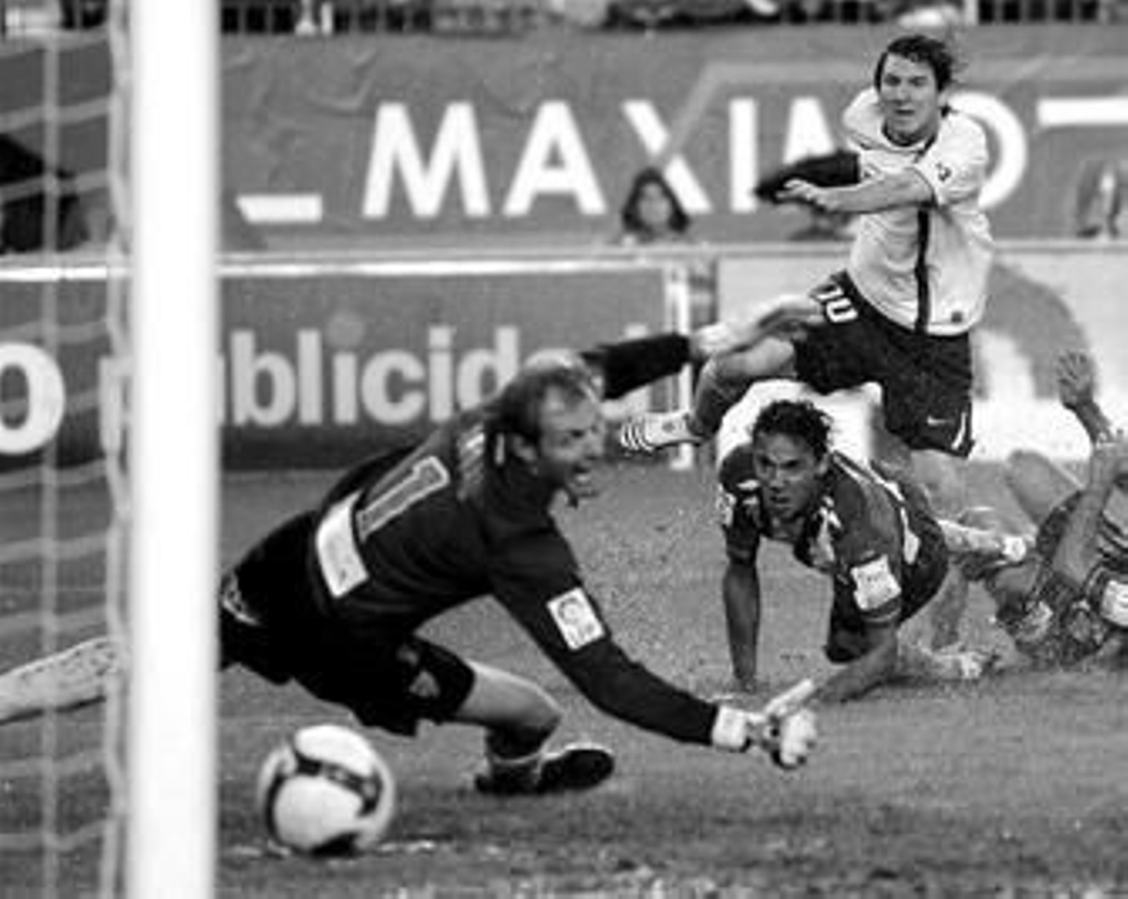El Barcelona, técnicamente superior, no tardó en marcar. Una falta en la frontal del área de Apoño a Messi, la aprovechó Xavi en el minuto 5 para colocar el balón en la escuadra.