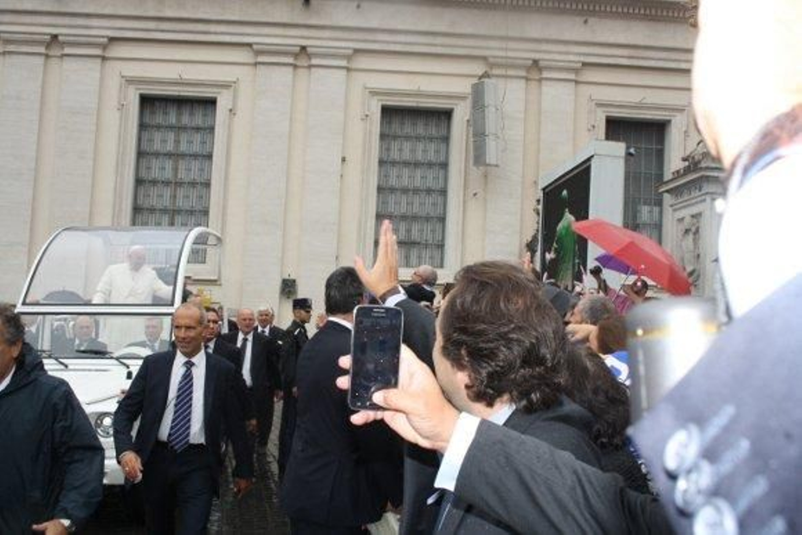 Tras su paso general por toda la plaza, el Papa saludó en el idioma de cada institución a los presentes y después de la bendición general, el Santo Padre se acercó a la tribuna lateral, donde fue estrechando la mano de los elegidos y recogiendo los presentes hasta que le tocó el turno a Pablo Comas. El dirigente albiazul le dio una carabela y su camiseta, elevando así el decanato a su cota más alta.