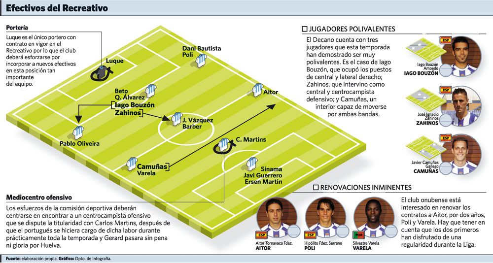 A tenor de todos los nombres que se quedan y se van, parece que las prioridades en la búsqueda de refuerzos del club albiazul van a ser la portería y la cabeza pensante del centro del campo, que luche con Martins por la titularidad. En el resto de posiciones también serán necesarios los refuerzos para, al menos, disponer de dos hombres en cada una pero en la mayoría de ellas el Recreativo ya cuenta con efectivos (comprobar en la infografía). La tarea de la comisión deportiva no es fácil ya que sus mayores esfuerzos se han de centrar en hallar dos de las piezas claves del armazón albiazul, su portero y otro cerebro de la medular. En cuanto al guardameta, no es descartable la renovación del joven Barbosa pero es necesario que el club negocie la ficha con el jugador. Menos probable parece la continuidad de Sorrentino, que se ha dado ha conocer esta temporada en la Liga española, contando con más adeptos que detractores tras jugar todos y cada uno de los minutos de esta temporada liguera, un dato a tener muy en cuenta.