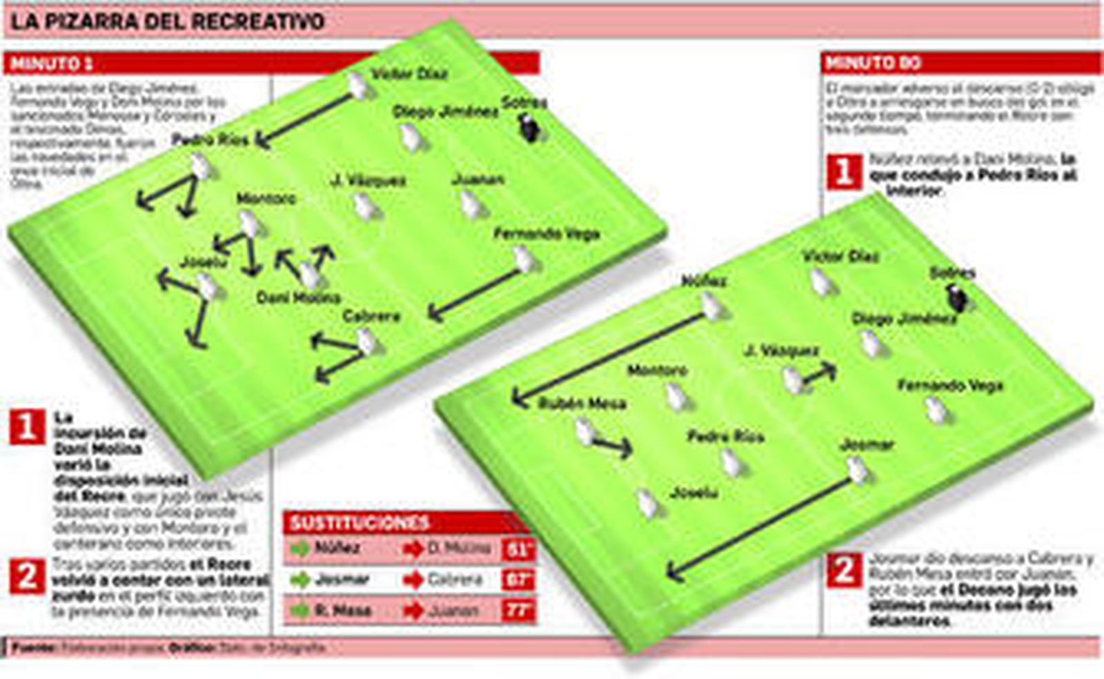 El Recreativo presentó una defensa inédita hasta la fecha en Liga con Diego Jiménez, que debutó ayer en el campeonato doméstico, como compañero de Juanan y con Víctor Díaz y Fernando Vega en los laterales. La presencia de un único hombre por delante de la zaga -Jesús Vázquez- convirtió al Decano en un equipo menos rocoso que de costumbre, aunque los mayores problemas defensivos del cuadro recreativista llegaron en acciones a balón parado, donde se encontró con un adversario con un excelente lanzador (Julio Álvarez) y con buenos rematadores, especialmente el autor del tercer gol, Juanma Marrero. Ello fue suficiente para que el Recre cayera.