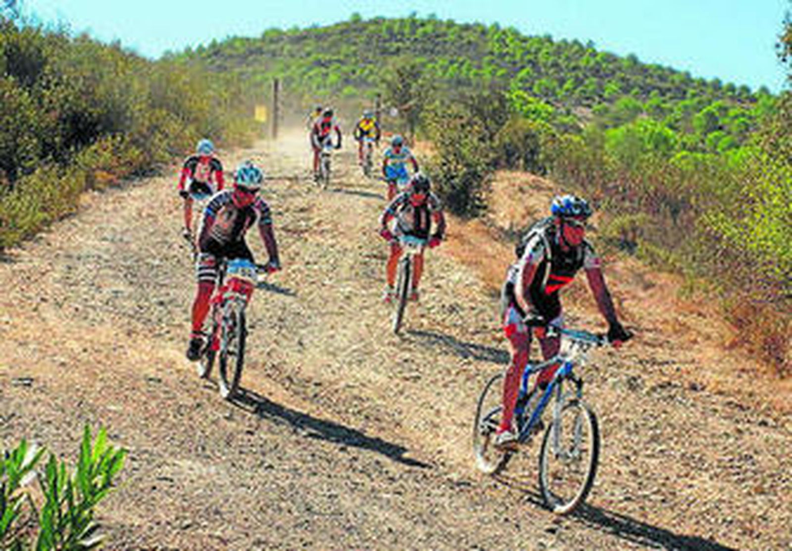 La marcha continuó por la antigua vía del tren minero que conectaba el embarcadero de San Juan de Aznalfarache con la antigua mina Peña del Hierro, hasta donde se dirigía el pelotón para afrontar el tramo competitivo, de la subida a la Torreta.