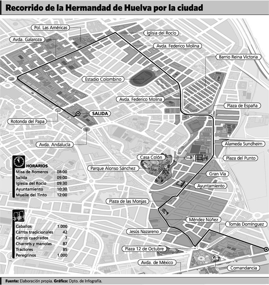 Así, tras pasar por la Avenida de Italia y alcanzar el edificio de Correos, los 42 carros tradicionales, los siete carros cuadrados, los 87 charrets, manolas y jardineras y los 85 tractores que componen el séquito romero, enfilarán la Avenida de la Ría y llegarán al Muelle de Riotinto a las 12.00 horas.