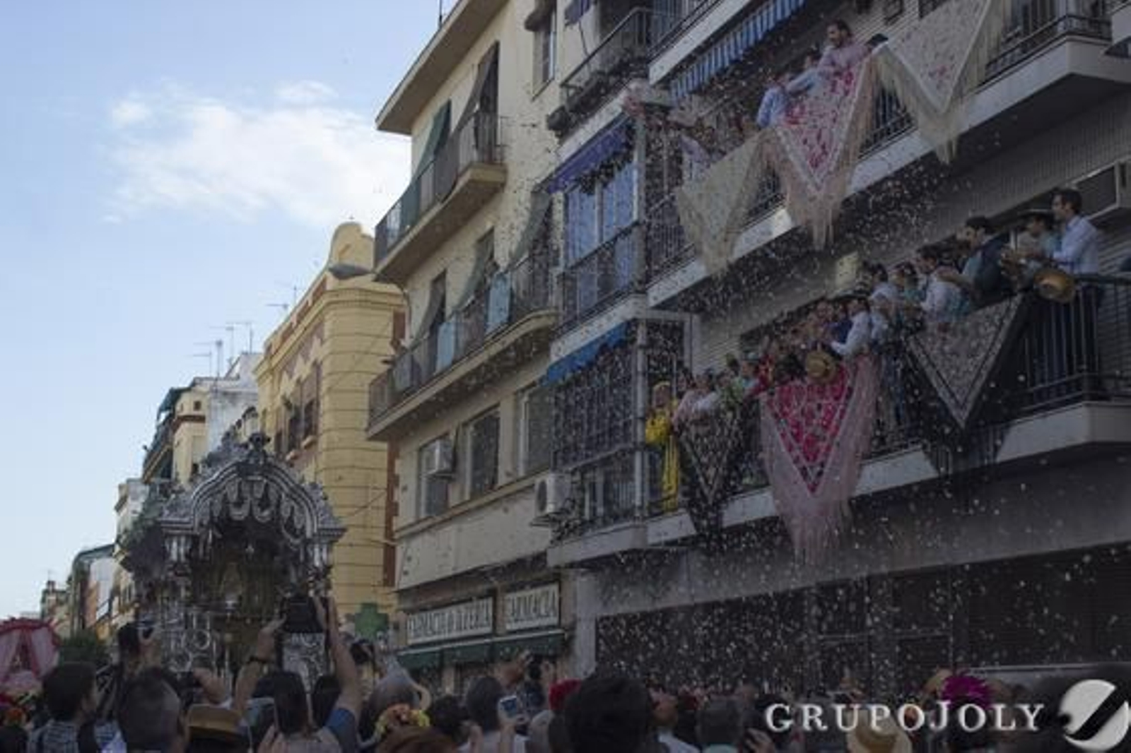 A poco de dar las nueve dos mujeres pisan el mármol frío de la basílica del Gran Poder. Llevan sobre sus cabezas flores de tela y un par de peinecillos. Lunares y flores estampadas cubren los vestidos de telas sueltas recién planchadas. Ropajes que en pocas horas conocerán sus primeras arrugas. Alzan la mirada hacia el único punto de fuga del templo. Rezos musitados. Un beso sobre el talón más conocido de la ciudad sirve de amuleto para el camino. Llega la carreta macarena. Hipérbole argéntea. Aniversario del simpecado con imagen nueva de Fernando Aguado. Arquitectura hilvanada en oro. Se hace el silencio. Un avemaría. Vítores metafóricos que se alargan cual pregón cuaresmal. "Divino Cisquero". "El de las manos misericordiosas". "El que siempre nos perdona". Letanía que enlaza los segundos con los vivas delante de la parroquia de San Lorenzo. No se deja ninguna advocación en el olvido. Hasta el Cristo del Mayor Dolor y la Virgen de Roca-Amador son pregonados en esta exaltación matutina con múltiples bostezos. Una plaza que registra media entrada de público. En la acera contraria, la estampa viva de la crisis. Sólo una carreta de bueyes acompaña a la hermandad macarena. Los brotes verdes, por ahora, sólo se perciben en las matas de romero.