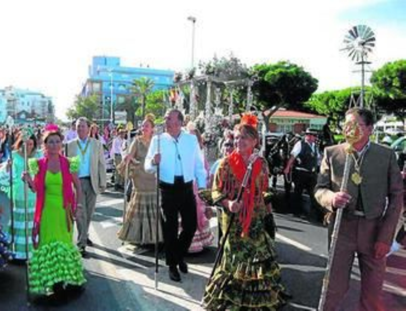 Muy orgullosa también iba la presidenta, Charo Beltrán por la gran comitiva que acompaña este año a la hermandad. Más de 30 enganches de caballos, otros tantos tractores-carriolas con las comodidades de una casa y unos 50 peregrinos a pie. Hace falta mucho valor para hacer este camino andando porque es muy duro llevarse tres días de asfalto y arena.