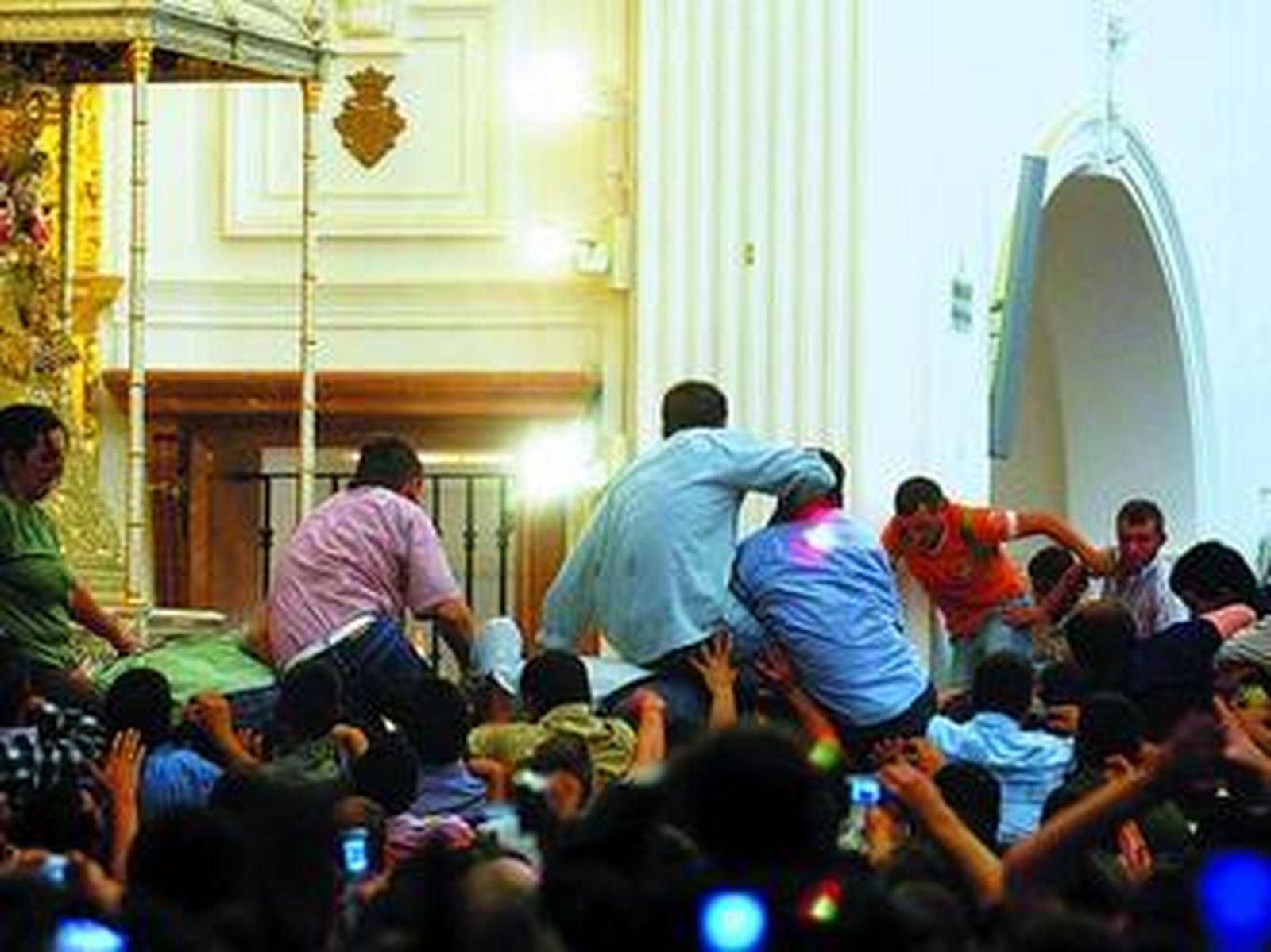 Entre palmas, vítores, salves y vuelos de niños a manos de los costaleros para ser acercados lo más posible a la Virgen, ésta volvió a su Santuario pasado el mediodía después de haber visitado a las 106 hermandades filiales que a su paso rezaron la Salve y le elevaron sus plegarias entre cantes y palmas.