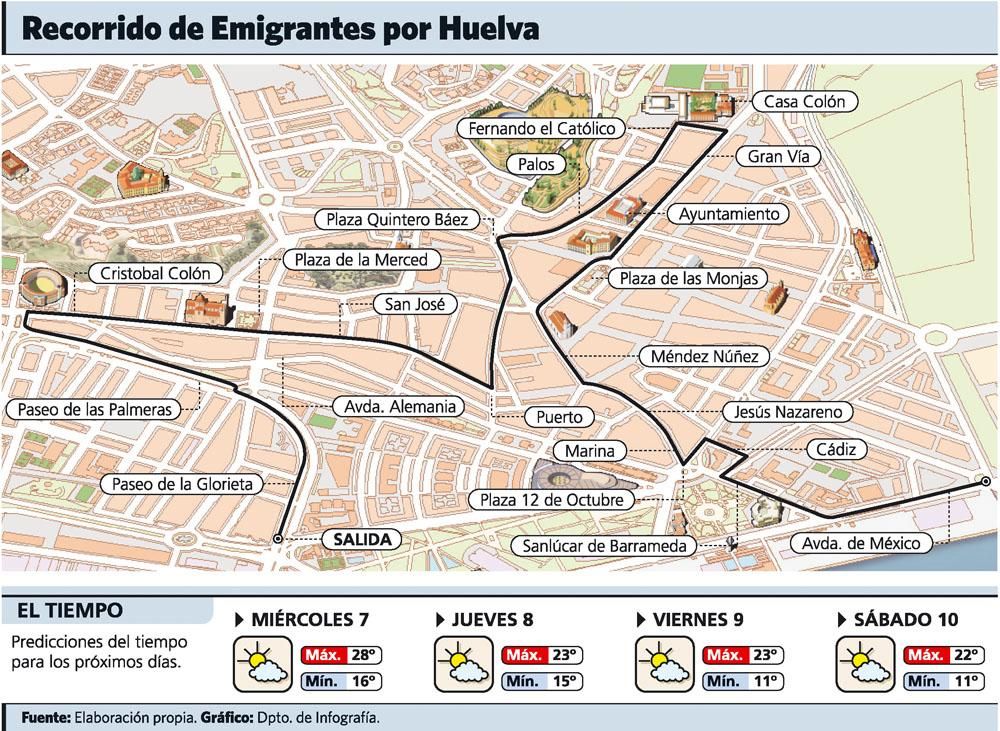 La salva de cohetes irá anunciando a los onubenses que Emigrantes se reencontrará pronto con la Virgen del Rocío y será sobre las 12.00 horas cuando el séquito (compuesto además por 40 enganches y 70 tractores) pase por la calle Marina de camino a la Comandancia de Marina. Tras cruzar la Avenida de Italia, la calle Cádiz y la Avenida Villa de Madrid, seguirán por Sanlúcar de Barrameda hasta la comandancia. Allí todos serán recibidos en torno a las 12.30 horas por las autoridades militares y la tropa le cantará la Salve Marinera, uniendo el sentir rociero con la devoción a la Virgen del Carmen, Patrona de los marinos. Al final del rezo, el comandante despedirá a la comitiva con el tradicional: "¡Rocieros, avante claro!".