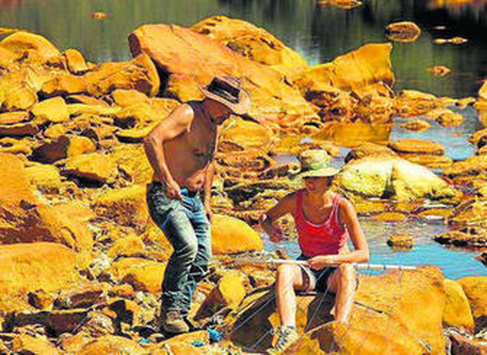 Varios artistas de la Cuenca Minera se encuentran realizando una atrevida e innovadora performance entre los restos del antiguo puente de Mendoza que atravesaba el río Tinto de orilla a orilla en su rojo discurrir por el término municipal de Berrocal. Se trata de una intervención en plena naturaleza que tiene como objetivo la reconstrucción artística de una desaparecida pasarela, bajo el patrocinio de uno de los ayuntamientos más pequeños de la comarca.
