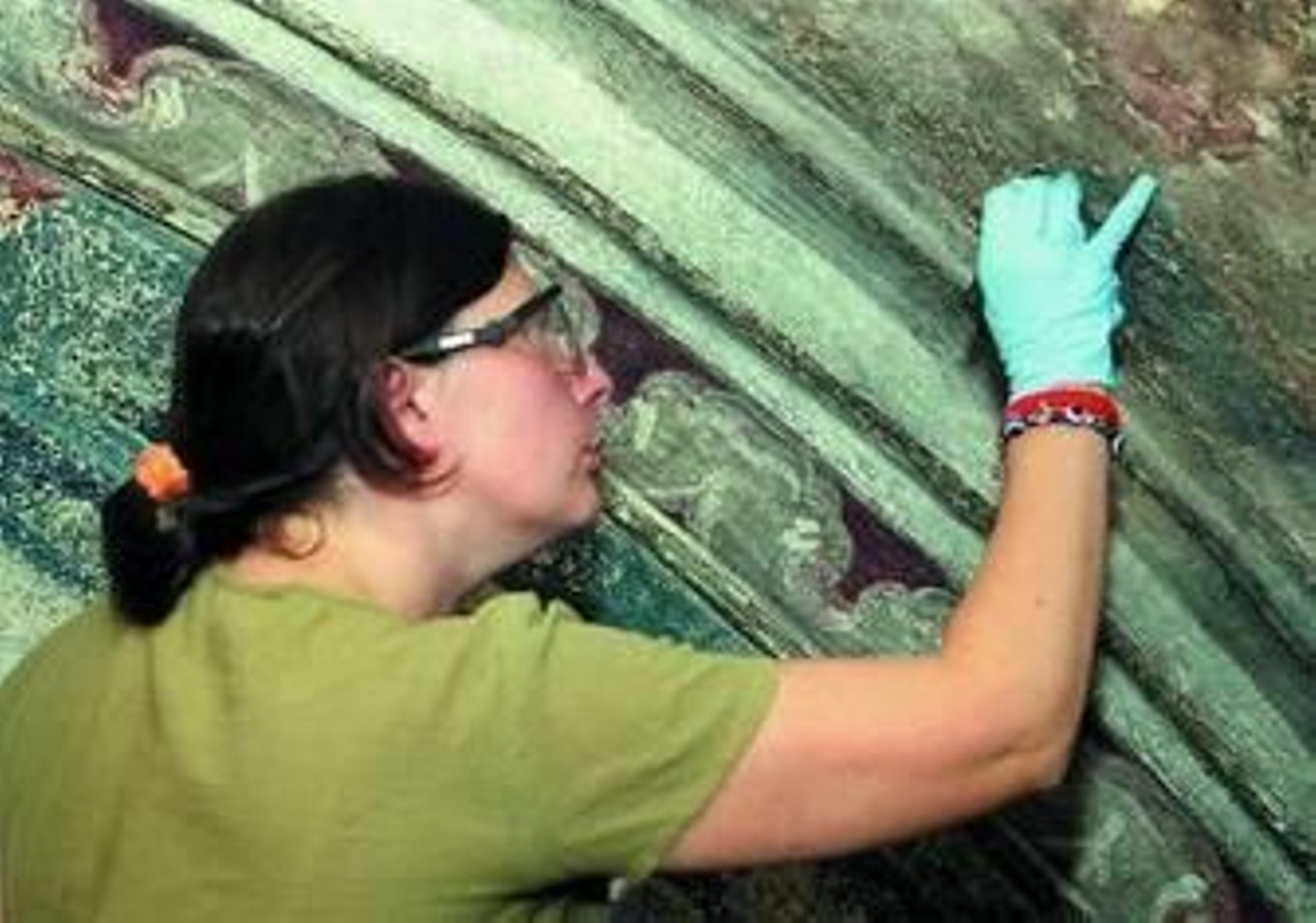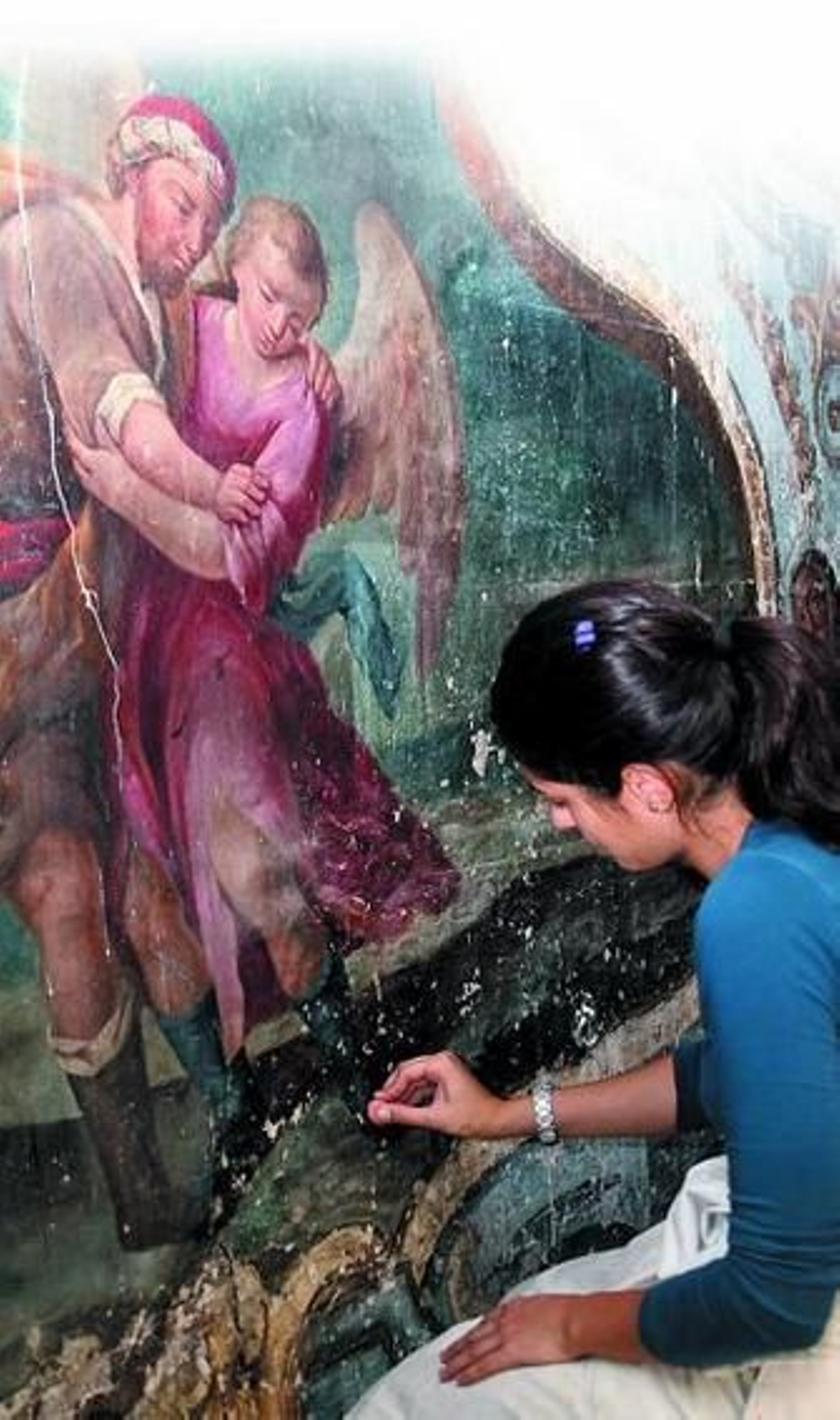 Mendoza, junto a su equipo restaurador, formado por Inma, Héctor, Rafael, Paula y Juan Pedro, se afana por devolverle el aspecto original a este sombrío, de momento, mural. Desperdigados por los diferentes pisos del andamiaje, y con variadas y singulares herramientas, -gomas de borrar, pincel, jeringas, lápiz de fibras de vidrio, sin disolventes para que estos no actúan en la pintura...- estos seis intrépidos restauradores van ganándole terreno a la suciedad.