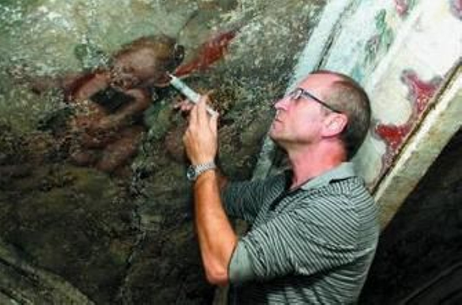 "Aún nos encontramos en la primera fase. Ya hemos fijado la policromía en peligro de desprendimiento, y a la vez que estamos limpiando, vamos inyectando las oquedades del mortero, del mortero base al muro, para evitar nuevos desprendimientos de mortero", explica Jesús mientras hace una demostración quirúrgica con una inyección sobre la bóveda.