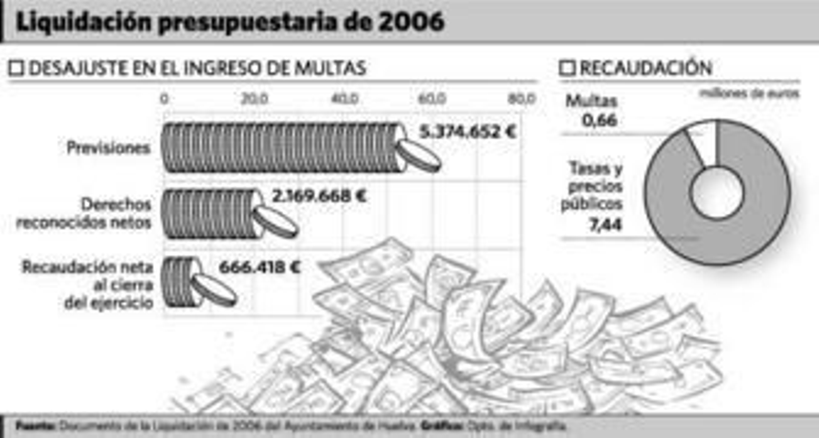 Así lo pone de manifiesto la última referencia oficial, el documento de la liquidación presupuestaria de 2006, certificando que la recaudación efectiva por multas ascendió este año a 666.418 euros, frente a los 2.153.244 euros que correspondía por Ley al Consistorio por las sanciones impuestas. Un desfase abismal si se compara lo ingresado con lo previsto al arranque del ejercicio: las multas cobradas sólo cubren un 12% de lo estimado en los presupuestos por este concepto, con lo que el Ayuntamiento ha dejado de percibir en un año 4,7 millones de euros, un montante que daría, por ejemplo, para hacer tres promociones de VPO como la que se entregó recientemente en Marismas del Polvorín.