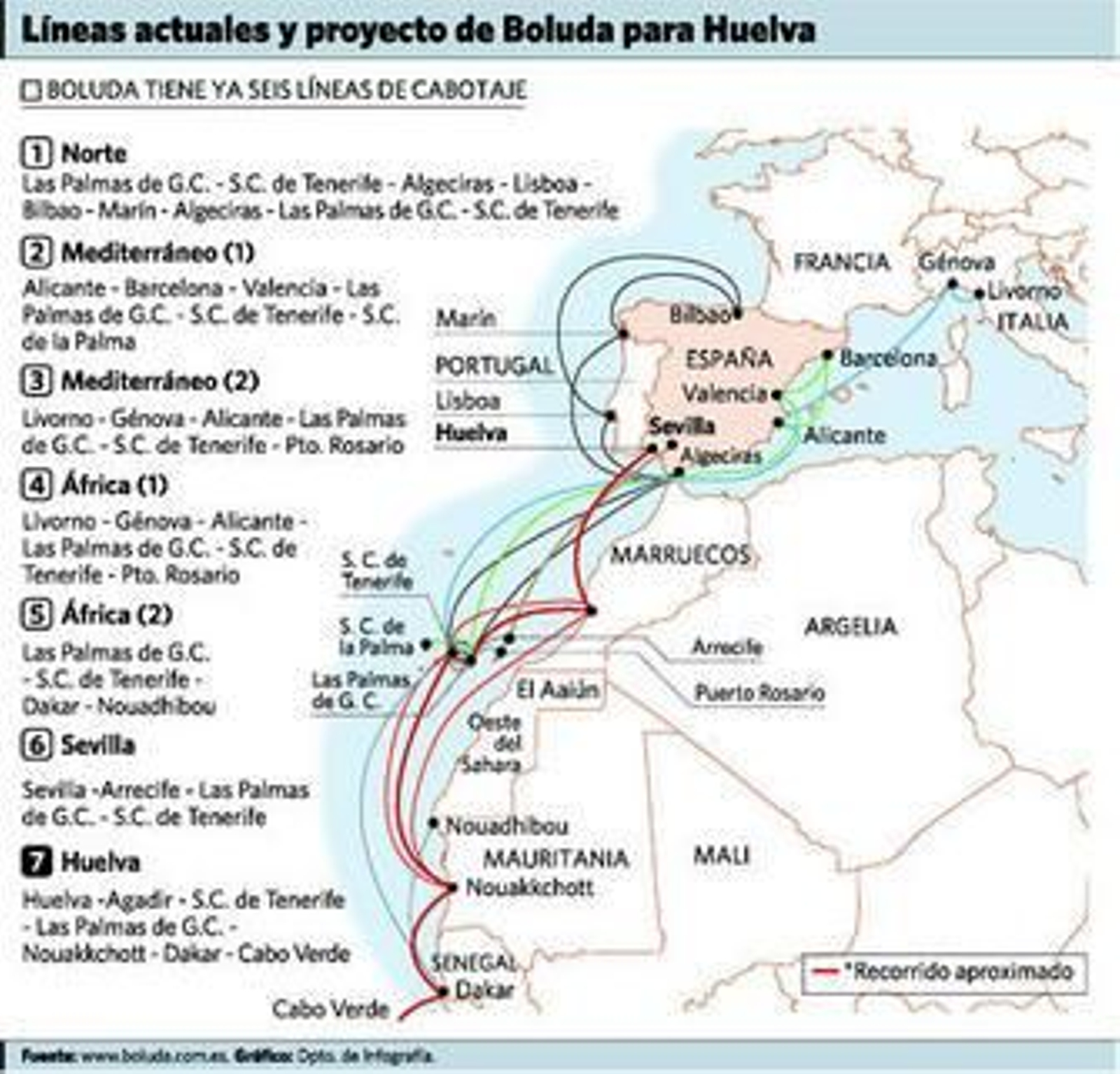 Boluda Corporación Marítima podría ser la segunda naviera en llegar a Huelva en cuestión de meses. El Grupo Boluda estudia la instalación de una línea marítima de transporte de pasajeros y mercancías entre Huelva, Canarias y algunos de los principales puertos africanos . Sería un servicio regular y de puesta en marcha de forma inmediata, a falta de que el Puerto apruebe el proyecto y la empresa se decida finalmente a ejecutar la inversión necesaria.