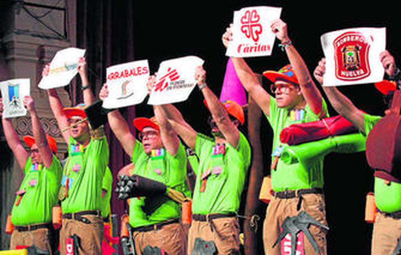 COMENTARIO. La bandada de palomos procedente de Punta Umbría se posa de nuevo en la bombonera onubense para reivindicar con sus letras la realidad. Entonó dos pasodobles, uno al drama de los desahucios y el segundo, con mucha fuerza y leñero, contra los recortes, una copla que acompañaron de pancartas. Entre el respetable existe división de opiniones sobre si se posaran de nuevo sobre las tablas en la final.