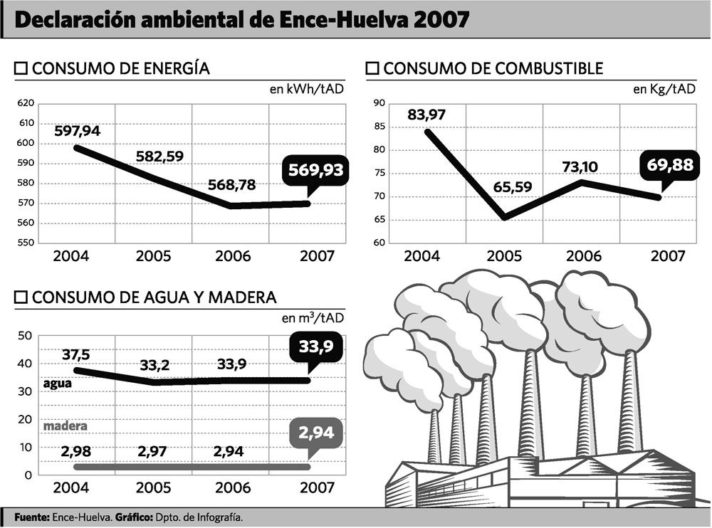 Isidro García Téllez estuvo acompañado en la presentación del documento por Silvia Cortinas Fernández, la jefa del departamento de Medio Ambiente de Ence-Huelva, quien subrayó que la mejora ambiental y el aumento de la eficiencia energética son los dos criterios en los que la empresa está basando su crecimiento. Los resultados de esta conciencia con la que gestionan la fábrica se traducen en una reducción al 4% del uso del combustible fósil en 2007, frente al 96% que supone ya la biomasa en el total de combustibles empleados en la fábrica onubense.