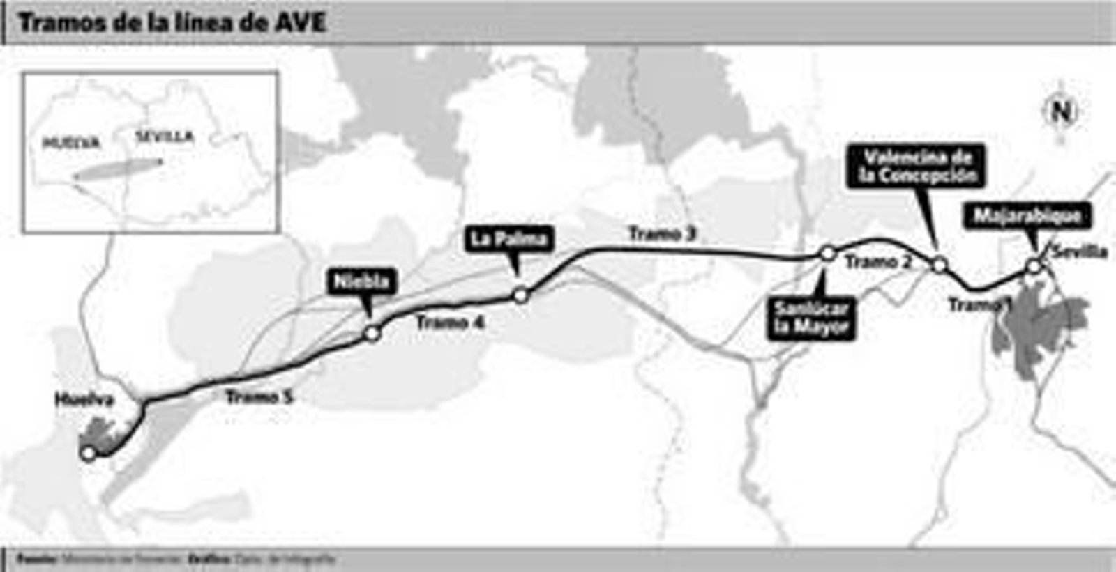 El tercer tramo, que cuenta con 22,5 kilómetros entre las localidades de Sanlúcar la Mayor y La Palma del Condado, incluye el viaducto sobre el Arroyo Giraldo. El cuarto, entre el citado municipio onubense y Niebla, medirá 20,5 kilómetros, incorporando el viaducto sobre el río Tinto y la estación de La Palma del Condado.