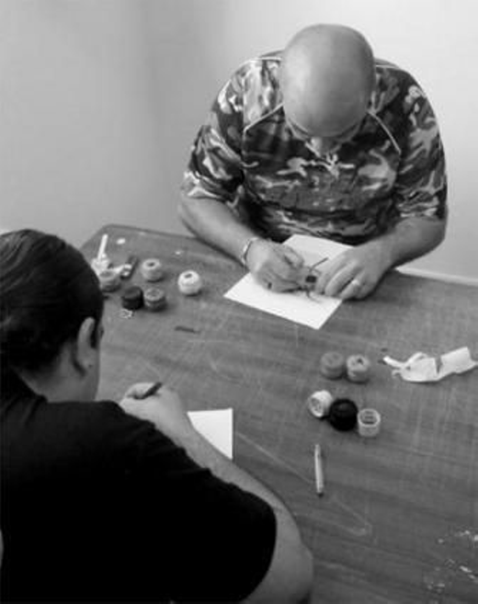 Un cortaúñas, un cepillo de dientes y una cuchilla de un sacapuntas. Tres elementos que por separado no muestran ninguna relación entre sí, aparentemente, pero que uniendo sus fuerzas son capaces de conformar una rudimentaria herramienta de tecnología 'con' punta capaz de esculpir verdaderas obras maestras. Cortaúñas para cortar, cepillo y cuchilla para perfilar. No hace falta más. Solamente, madejas de hilo, cintas adhesivas, una copia de un cuadro o dibujo de un maestro de la pintura y, sobre todo, muchas ganas de trabajar y de evadirse de una prisionera realidad.