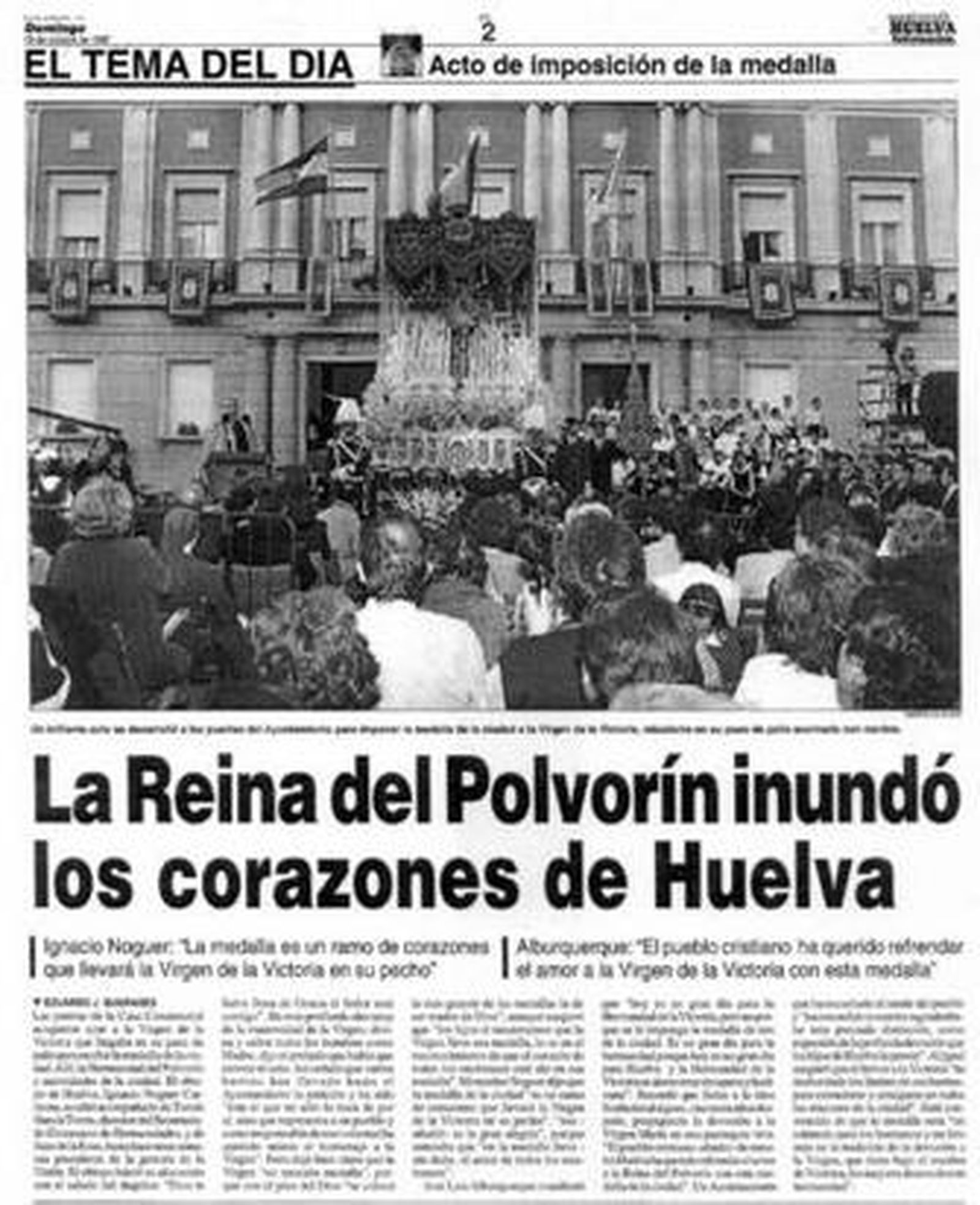 De aquí sólo un paso a recibir la medalla de la ciudad. Aquel cincuentenario reaviva muchos sentimientos y un gran afán de superación en la cofradía con la implicación de los barrios, del Matadero y Reina Victoria, que hacen oficial el deseo de todos con la petición al Ayuntamiento de la concesión de la medalla de la ciudad. Así se concedió el 24 de abril de 1997. La imposición tuvo lugar el sábado 18 de octubre de 1997. La lluvia, lo mismo que ahora, apareció en el traslado matinal hacia el centro, por lo que se aplazó unas horas. La Virgen de la Victoria llegó hasta la parroquia de la Concepción desde donde salió a las puertas del Ayuntamiento, allí el alcalde Pedro Rodríguez González le impuso la medalla de Huelva. En un acto en el que intervino el obispo Ignacio Noguer, que fue muy acertado al señalar que la Virgen no necesita medalla, porque con el plan de Dios "se colocó la más grande de las medallas, la de ser madre de Dios", para asegurar a renglón seguido que "sus hijos sí necesitamos que la Virgen lleve esa medalla, lo es en el reconocimiento de que el corazón de todos los onubenses está ahí en esa medalla". Un acontecimiento que presidió el hermano mayor Luis Alburquerque Lopera.