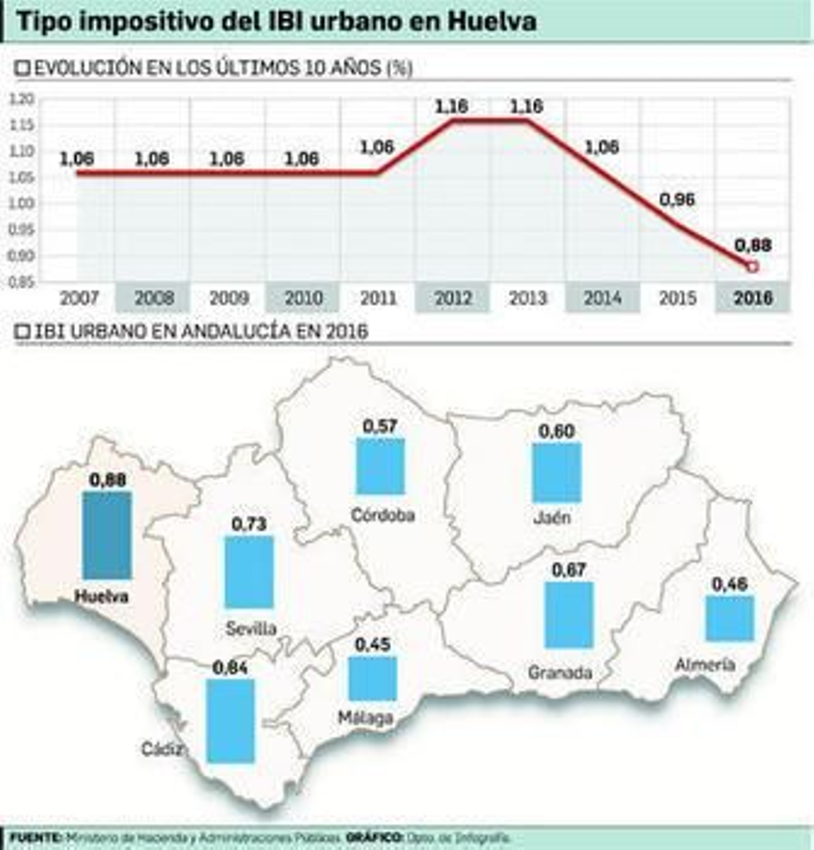 Esta decisión situó el porcentaje del tipo impositivo para este año en un 0,88, ocho puntos menos que el 0,96 aplicado en 2015. Sin embargo, y pese a esta medida, la capital onubense se erige este año como la que cuenta con un IBI urbano más alto de toda Andalucía, concretamente la que aplica un tipo impositivo mayor, según los datos publicados en la Oficina Virtual para la coordinación financiera con entidades locales del Ministerio de Hacienda. Si se compara con el de otras capitales españolas, también está entre los más altos, superado sólo por Tarragona (0,95), Ciudad Real (0,92) y Girona (0,886).
