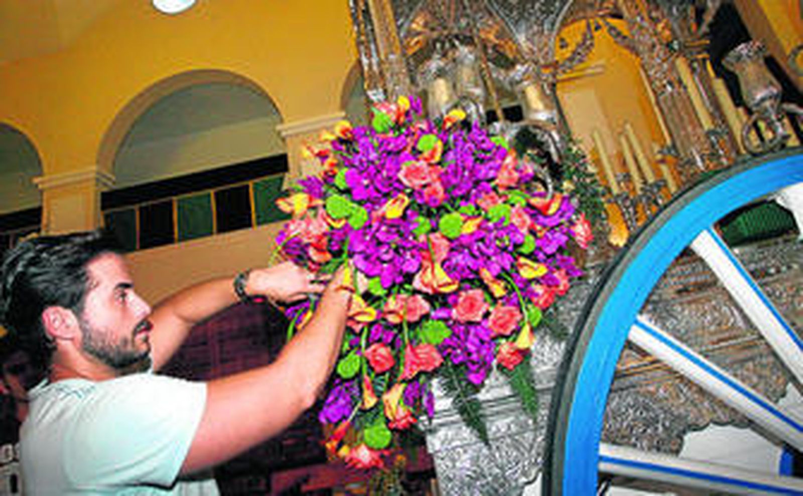 En la tarde de ayer se procedía al exorno de la carreta de plata que corre a cargo de Antonio Rivera, de Victoria Arte Floral, junto con el equipo de camaristas de la hermandad. Este año se combinará los tonos malvas y el naranja, serán en orquídeas y rosas; además de claveles color pistacho, con lo que se espera que ofrezca un gran golpe de efecto visual, como viene siendo característico en la carreta desde que se encarga de las flores Antonio Rivera.