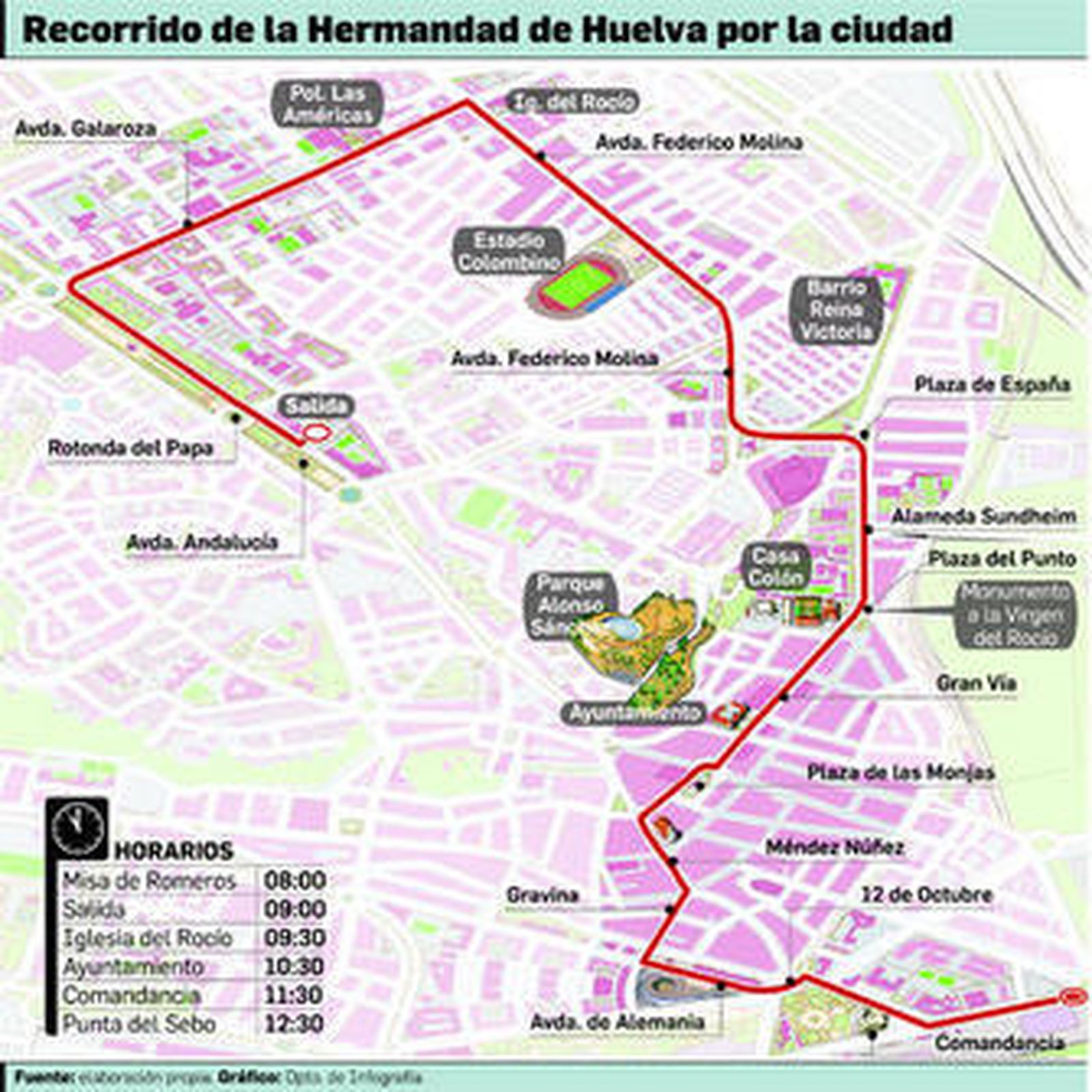 Este año es, además, especialmente significativo para la Hermandad de Huelva, al celebrar el 75 aniversario de la bendición del Simpecado, que fue realizado en 1939 por una suscripción popular, tras haber sido destruido en el asalto a la parroquia en la Guerra Civil. Hasta este templo acudió en el mes de mayo la Hermandad de Huelva con su Simpecado para la celebración del triduo y función principal conmemorativa de los 75 años de esta obra realizada en los talleres de Esperanza Elena Caro, siendo una de las piezas más interesante del bordado andaluz. La hermandad también realizó, por vez primera, una procesión por la ciudad con carácter extraordinario, recorriendo el centro desde la Plaza de San Pedro al Ayuntamiento, donde se le entregó una réplica de la medalla que en su día el concedió el Ayuntamiento de Huelva, donde hoy se espera que sean recibidos los rocieros a las 10:30, donde actuarán el Coro Voces del Conquero y el Orfeón Onubense. Otros momentos importantes del recorrido será en la iglesia del Rocío (9:30) donde es recibida por la parroquia y se reza la Salve. Luego habrá ofrenda de flores ante el monumento a la Virgen del Rocío y a la Comandancia de Marina llegarán sobre las 11:30.