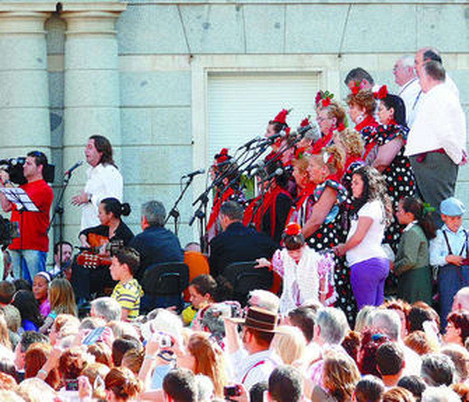 El sonido alegre del tamboril y la flauta ponía la música en la mañana rociera. Flores nada más que salir, al monumento al Papa Juan Pablo II, y una visita especial al de la Virgen de la Cinta, donde estaba su hermandad y su hermano mayor, Manuel Roméu, ofrendaba al Simpecado con un ramo de flores. Pronto enfilaba la calle Galaroza, la hermandad quería cumplir los horarios, la comitiva es larga y hasta que pasa el último tractor por la puerta del Ayuntamiento es ya pasado el mediodía. Paradas en cruces de mayo, en la del Este y La Soleá. Mientras se va escuchando el campanil de la parroquia de Nuestra Señora del Rocío hasta donde acude un gentío de las muy diversas barriadas de este entorno popular onubense que tanta vinculación tiene la hermandad. Hasta aquí llegaba el hermano mayor con la carreta a los gritos de Huelva Huelva y se escuchaba la Salve Rociera. Todo Federico Molina era un mar de gente entorno al Simpecado. Por la plaza del Estadio recuerdos de que esto ya no es lo que era, un lugar de tardes de rocieras con las niñas vestidas de gitana.