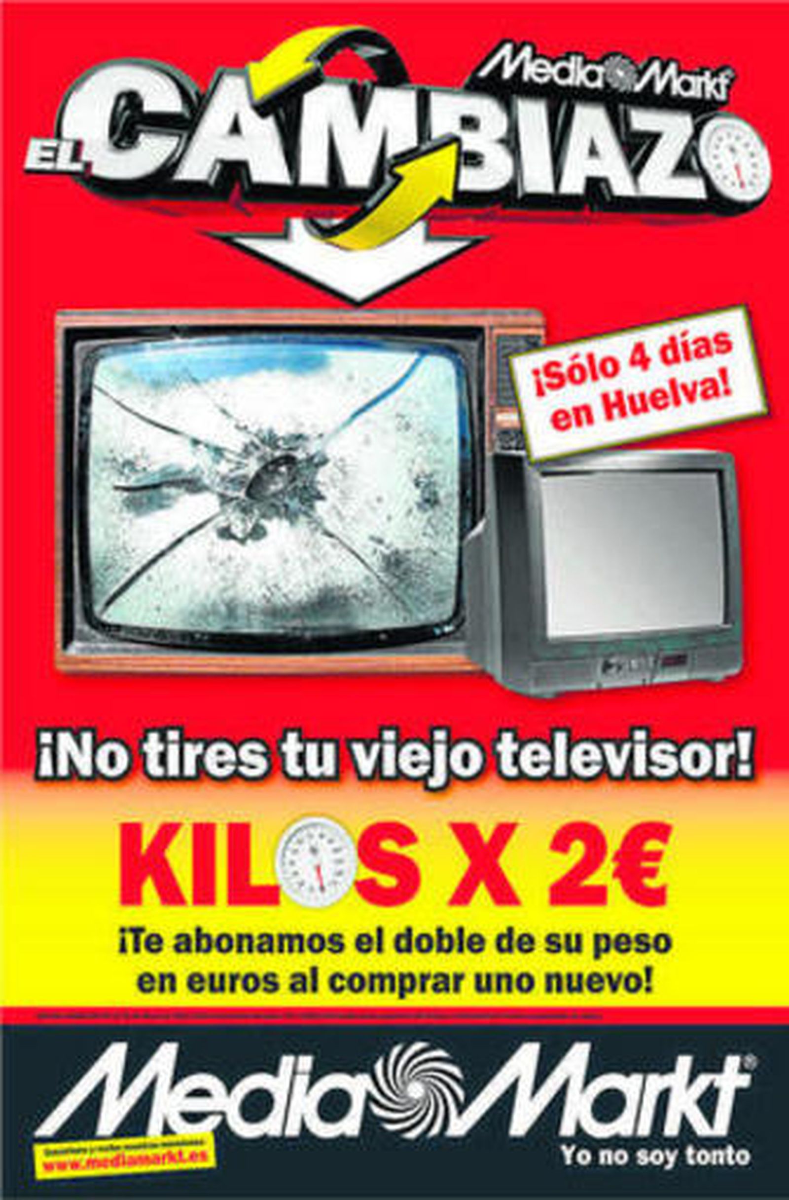 Esta nueva oferta está destinada a los televisores, sea cual sea el modelo y la antigüedad. No se trata de valorar el estado del aparato ni su funcionamiento, sino su peso. Y el Cambiazo consiste en que cada televisor que se lleve a la tienda será pesado y ese peso será multiplicado por dos. La cifra resultante será la misma que Media Markt descontará al cliente por la compra de un nuevo televisor. La oferta sólo es válida para televisores y el Cambiazo únicamente se realiza unidad por unidad. Así que si su televisor pesa 40 kilos, ponemos por ejemplo, Media Markt le descontará 80 euros en la compra de un nuevo televisor.