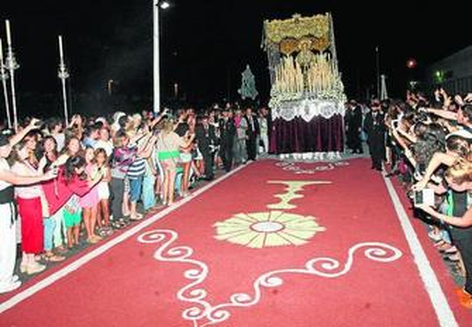 De esta manera, arcos, flores y colgaduras adornaron en la tarde y noche de ayer el inédito recorrido que llevó a la Virgen de los Dolores a todas las zonas del barrio por las que no pasa en su salida procesional en el Lunes Santo, como La Orden Baja o Santa Marta.