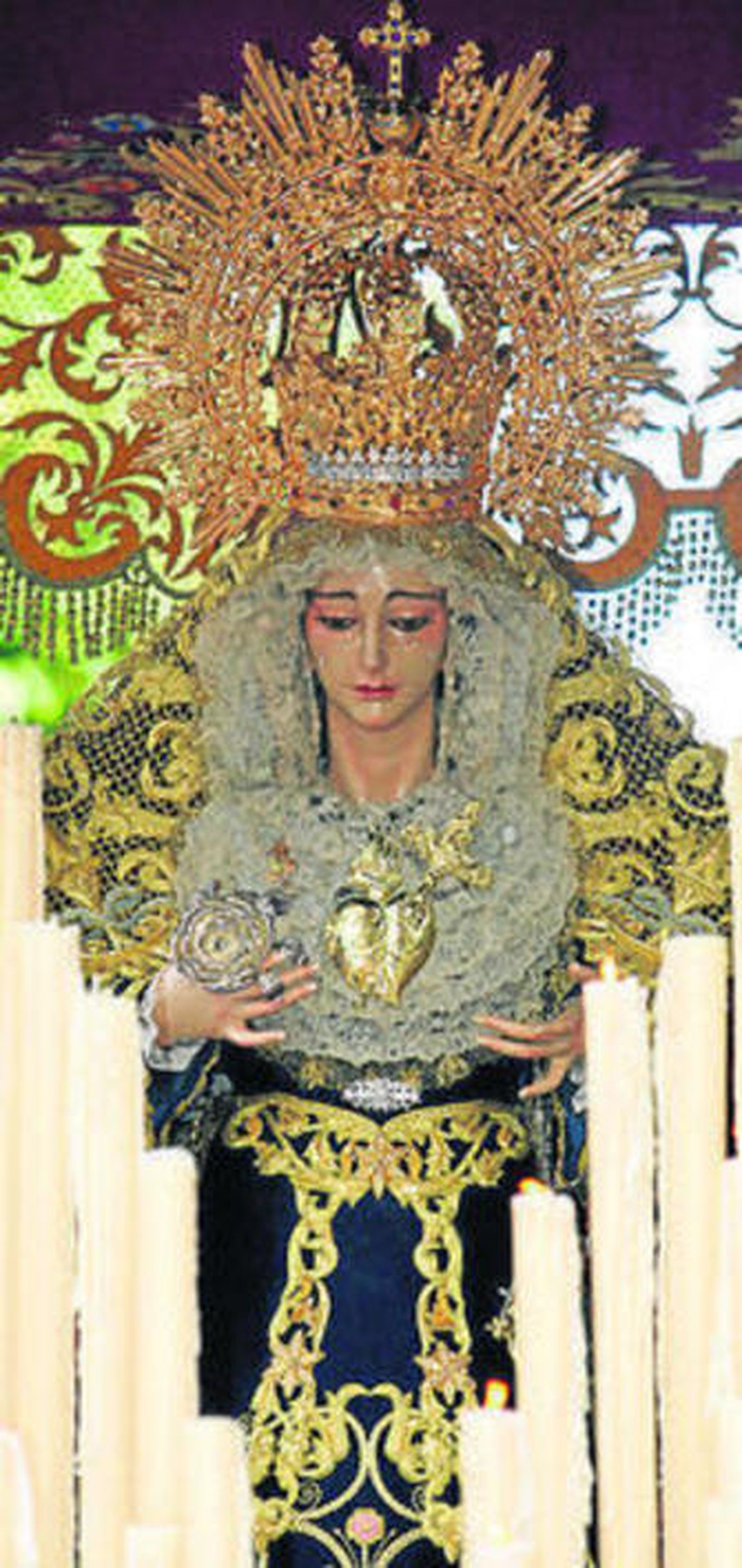 Vestida por Mariano Martín Santonja y adornada con rosas blancas y ornithogalum de Floristería Las Mimosas, de Pepe Brioso y familia, Nuestra Señora de los Dolores -que el Lunes Santo procesiona en el paso de misterio acompañando al Cristo del Perdón- lució el manto de la Virgen del Rosario, de la Hermandad de la Cena, presumió de candelería y estrenó fajín y saya, entre otras piezas. La saya bordada, obra de Mariano Martín Santonja, fue regalada con las aportaciones de los hermanos y devotos.