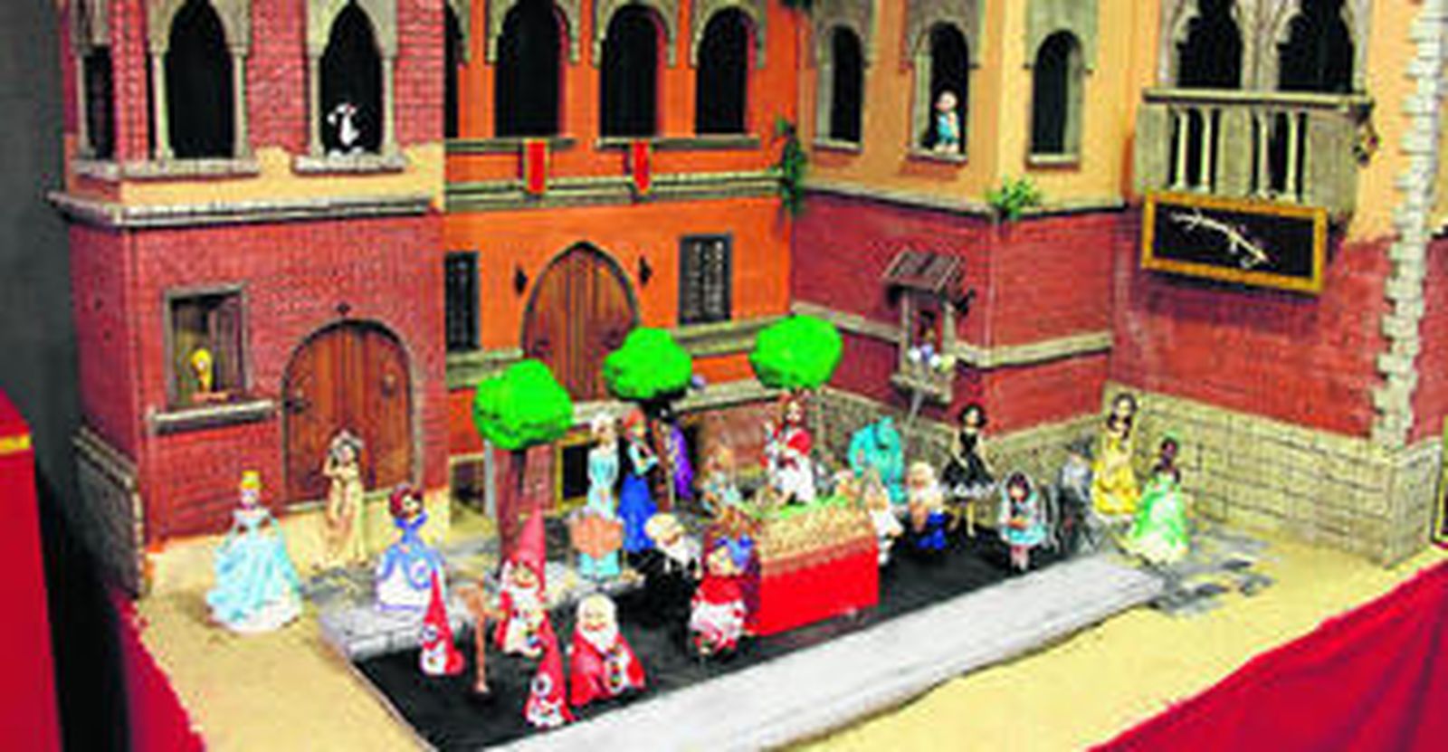 Los titulares de la cofradía infantil del CEIP San Sebastián, de Rociana, también forman parte de la exposición, así como dos dioramas de la entrada en Jerusalén, uno de Juan Manuel Seisdedos, en el que ha utilizado figuras de la cabalgata de Reyes, concretamente Pitufos y Minions, y otro de la repostera Teresa Gil, realizado con personajes de Disney y Warner en fondant con calles de chocolate, una composición que es fruto de dos meses de trabajo.