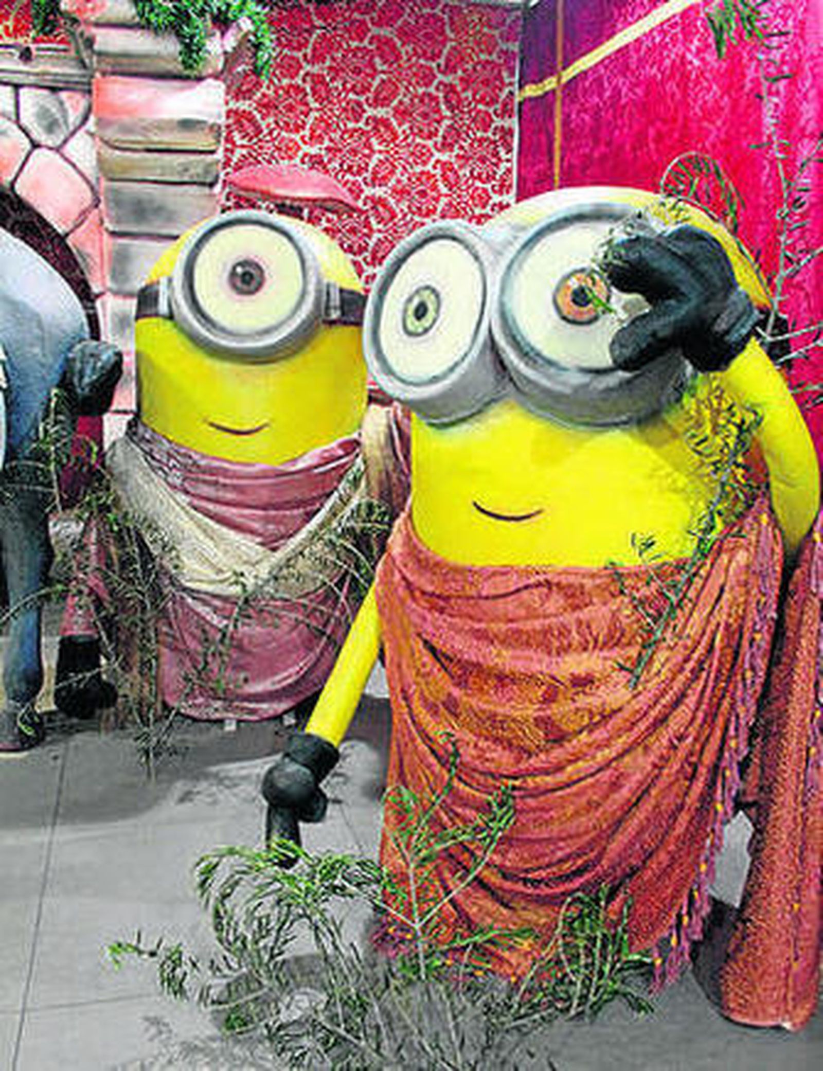 Un minion vestido de hebreo da la bienvenida al visitante en la exposición, donde se muestra por primera vez una colección de dibujos de cristos y vírgenes de cofradías de Sevilla, así como imágenes de la Virgen del Rocío, de Manuel J. Garzón. Junta a ella, óleos de Clemente Rivas.