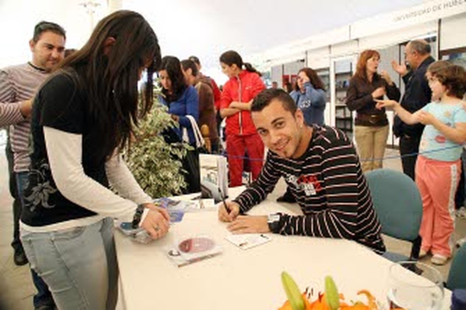La Feria tuvo su acto más popular por la tarde con la firma de la primera novela, 'El Espejo', del cantante onubense Sergio Contreras. Se trata de una historia de un chico que sufre desde pequeño el rechazo materialista de la sociedad, y así acaba conociendo a su mejor compañera, la soledad. También firmaron libros Antonio J. Sanabria Girón y Julio Martínez Camacho.