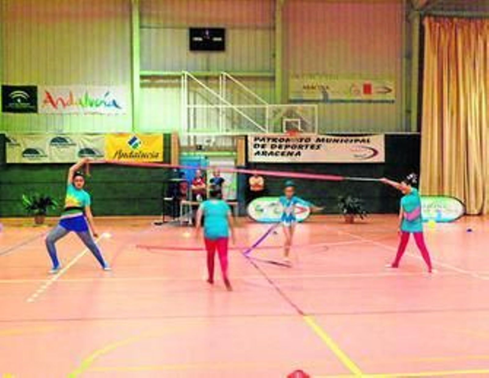 Aros, cintas, aros, pelotas, figuras, saltos, color, música, talento y alegría. El pabellón cubierto del polideportivo de Aracena se ha convertido recientemente en escenario de una gran fiesta de fin de curso, la realizada por la escuela municipal de gimnasia rítmica perteneciente al Patronato Municipal de Deportes aracenense.