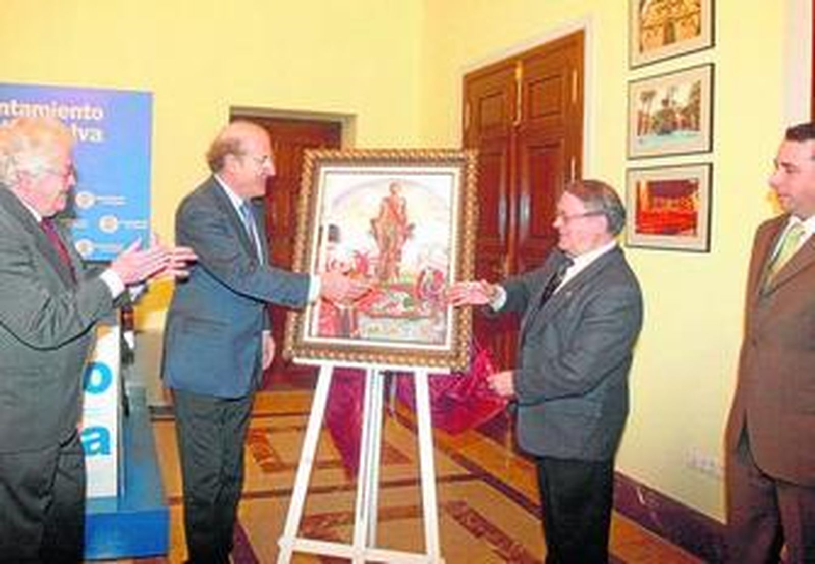 Presentó a pregonero y pintor. El primero, el decano de los abogados de Huelva, Juan José Domínguez, del que dijo que era "un onubense de pro, un onubense del corazón, de inteligencia y razón, que ha defendido a muchas personas y ayudado a numerosos desfavorecidos, es un hombre profundamente bueno". De Esteban Aparicio Mansilla destacó que es un burgalés que lleva más de 30 años en Huelva en la Comunidad Marista, donde es profesor de Física-Quimica y Matemáticas y ha dado clase a varias generaciones de onubenses. "Es un gran pintor que lo ha demostrado en exposiciones, en sus obras tiene mucho realismo, incluso a veces llegando al hiperrealismo". Considera que ha sido un acierto su designación, porque el cartel refleja la esencia de lo que es la fiesta del Patrón San Sebastián". El hermano Esteban reconoció que fue como "un atraco" cuando llegó el anterior hermano mayor, Luis García Alejo, a "obligarme a pintarlo". Pero el argumento fue contundente, la vinculación y cercanía del Colegio Marista con la parroquia de San Sebastián durante tantos años. De no haber sido así, asegura que "no lo hubiera hecho nunca". Le animó también otra persona que le ha ayudado en la idea, "por eso lo firmo Mansilla-Paco, que ha ideado esta especie de composición del martirio de San Sebastián". Al final, contento: "A mí no me disgusta". El cartel ofrece gran colorido y se viene a la vista, recoge el momento en el que el paso del Patrón está en el centro de la iglesia de San Sebastián, enmarcado por un acólito con su cirial. San Sebastián en su paso parece como en el momento del martirio, ya que juega para ello con la pintura de fondo del altar mayor de la parroquia del mártir.