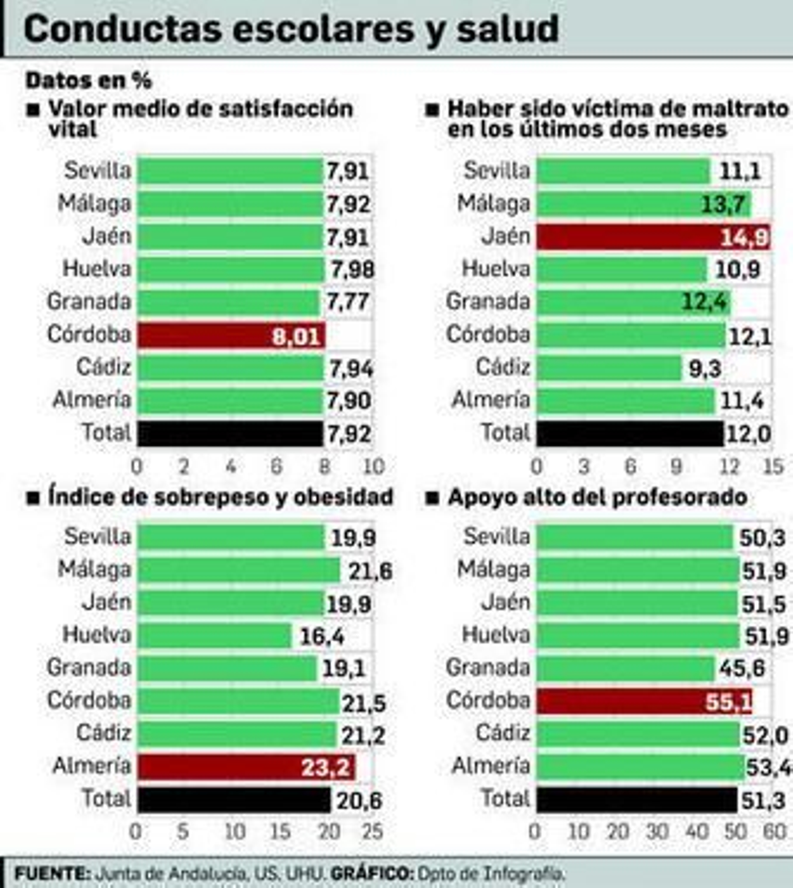 Un 17,7% de los jóvenes onubenses consume dulces a diario (un dato que supera la media, que es de 16,7%) y un 37,3% (la media está en el 34,2%) consume bebidas azucaradas cada día. Sin embargo, son los onubenses los que destacan por su bajo índice de sobrepeso y obesidad, mientras que ocurre lo contrario en el caso de Almería: el índice de sobrepeso andaluz es de 20,6% pero en Huelva se sitúa en el 16,4% y en Almería en el 23,2%. Por ello, la satisfacción de los adolescentes de la provincia con su imagen corporal es la más elevada de Andalucía, aunque las diferencias son mínimas: la media es de 3,74 en una escala de 1 a 5 y en el caso de Huelva esta cifra asciende a 3,85. Rivera cree que las alternativas de ocio "menos sedentarias" y un ocio más activo que en otras provincias pueden explicar estas variables aunque, a pesar de las mismas, "hay que potenciar el consumo de frutas y verduras, que en Andalucía, de todas formas, es bajo".