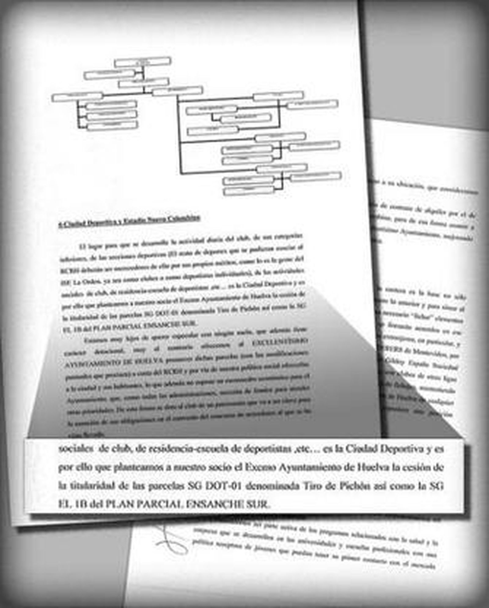 En su Plan de Negocio 2011-2020, dicha oferta asumida en el contrato incluía la entrega de esos terrenos a los nuevos socios, como se indica en el documento reproducido por este diario: "El lugar para que se desarrolle la actividad diaria del club, de sus categorías inferiores, de las secciones deportivas, de las actividades sociales del club, de residencia-escuela de deportistas, etcétera, es la Ciudad Deportiva y es por ello que planteamos a nuestro socio el excelentísimo Ayuntamiento de Huelva la cesión de la titularidad de las parcelas SG DOT-01 denominada Tiro de Pichón, así como la SG EL IB del Plan Parcial del Ensanche Sur".
