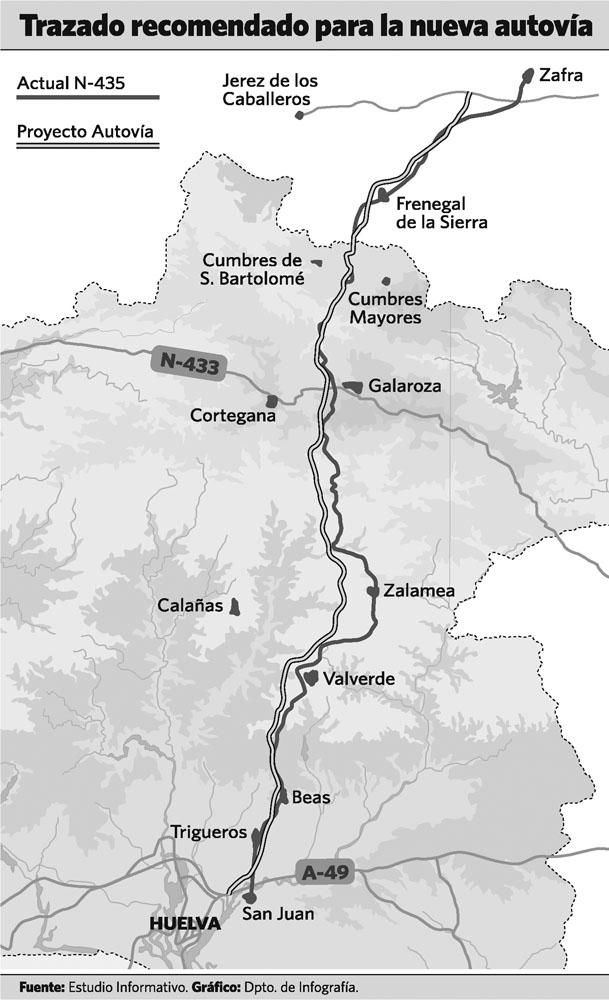 La provincia de Huelva ya tiene trazada su ansiada autovía hasta Badajoz, la carretera que conectará el Puerto con Extremadura y que se convertirá en la entrada y salida de la provincia hacia el Norte de la Península. El reivindicado desdoble de la nacional 435 consiste finalmente en una autovía de nuevo trazado, prácticamente paralela a la carretera nacional, que tendrá 137 kilómetros de longitud y costará más de mil millones de euros si se cumple el presupuesto contemplado en el estudio informativo de esta infraestructura. Y además, podría contar con varios tramos de carretera convencional al Norte de la provincia de seguirse las instrucciones iniciales del Ministerio de Fomento.