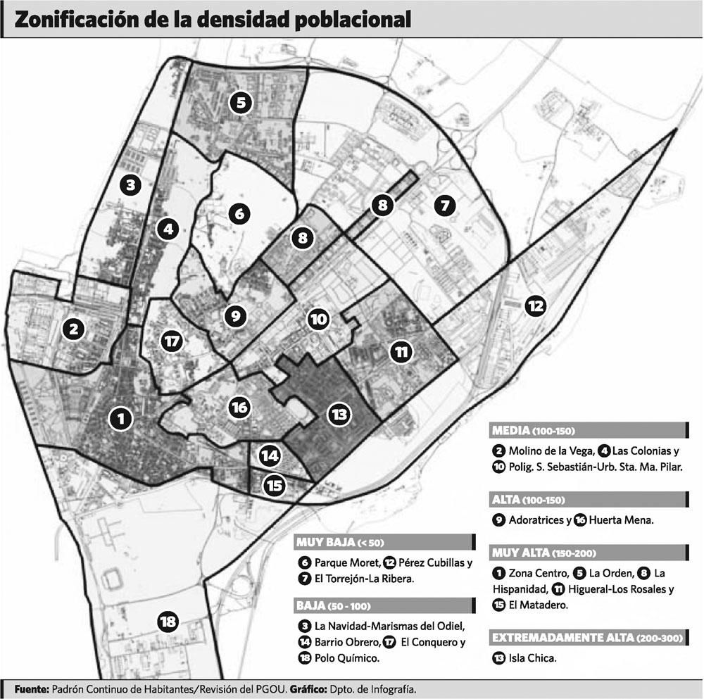 En esta cartografía que sirve de diagnóstico de las necesidades poblacionales, figuran como barrios de "densidad alta" Las Adoratrices y Huerta Mena (la zona entre Pío XII y el solar del estadio de Isla Chica). En un nivel inferior, se considera que tienen una proporción más ajustada entre residentes y superficie las barriadas de El Molino de la Vega; Las Colonias; el Polígono de San Sebastián y la urbanización de Santa María del Pilar.