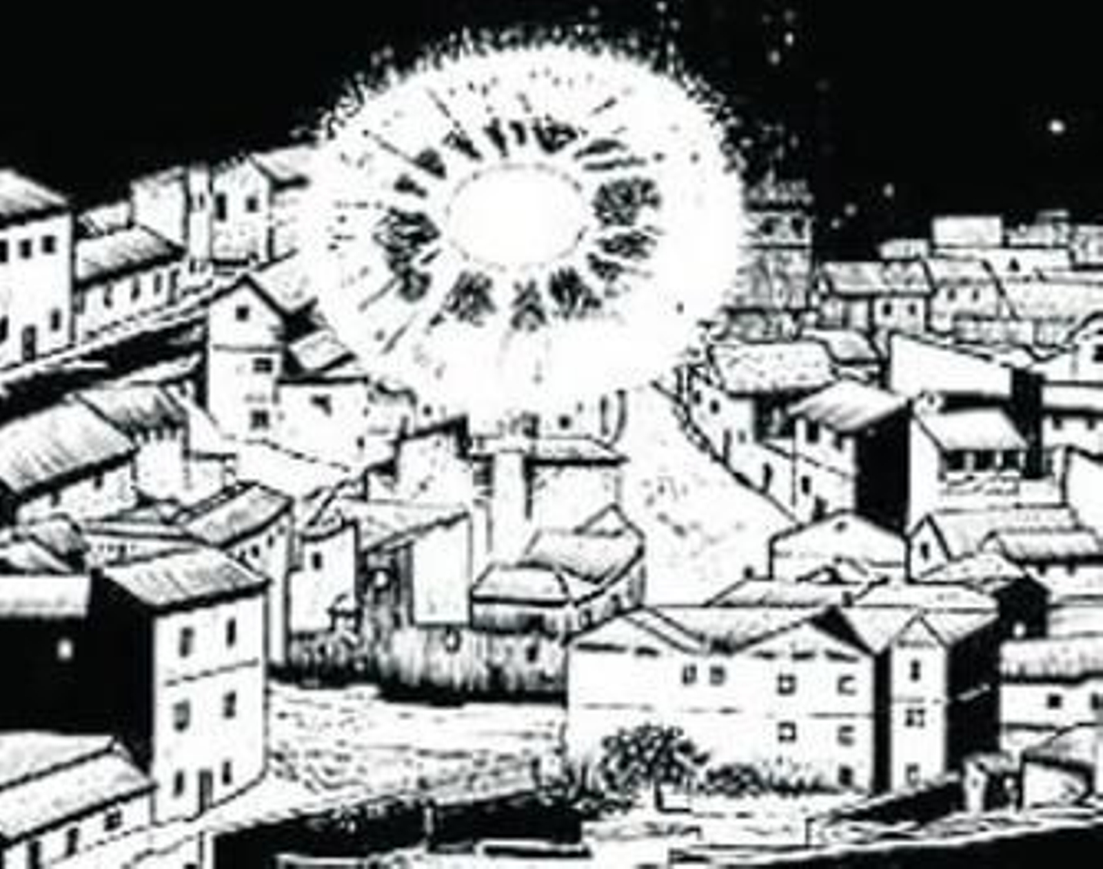 La solemne procesión anual de la Inmaculada Concepción transcurría sin novedad por las calles del pueblo, cuando, de repente, los numerosos fieles que caminaban lentamente alineados en las dos filas del cortejo religioso contemplaron atónitos en el cielo "una pelota grande del color del fuego que giraba y parecía que iba dando vueltas". El fenómeno lumínico se desplazaba lentamente hasta tal punto que, según el relato del investigador, a algunos devotos les dio tiempo de ahumar cristales para observarlo mejor, lo que indica, por otra parte, que el objeto esférico despedía un fulgor muy intenso.