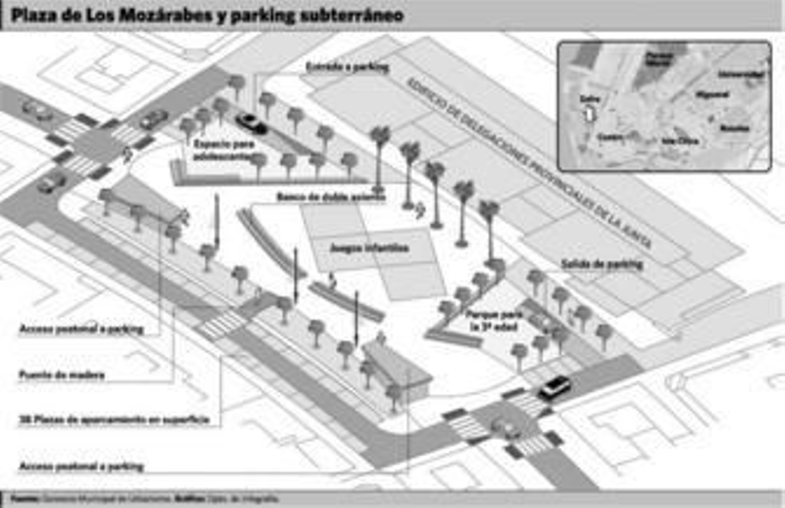 La remodelación de la calle Los Mozárabes convertirá esta vía en el eje central del barrio de Zafra. La calle se transformará en una gran plaza pública, la segunda en cuanto a superficie, después de la plaza de las Monjas, del centro de la ciudad. El espacio albergará un parking subterráneo con capacidad para 250 vehículos, distribuidos en dos plantas, contribuyéndose de esta manera a paliar el déficit de aparcamientos que hay en la zona.