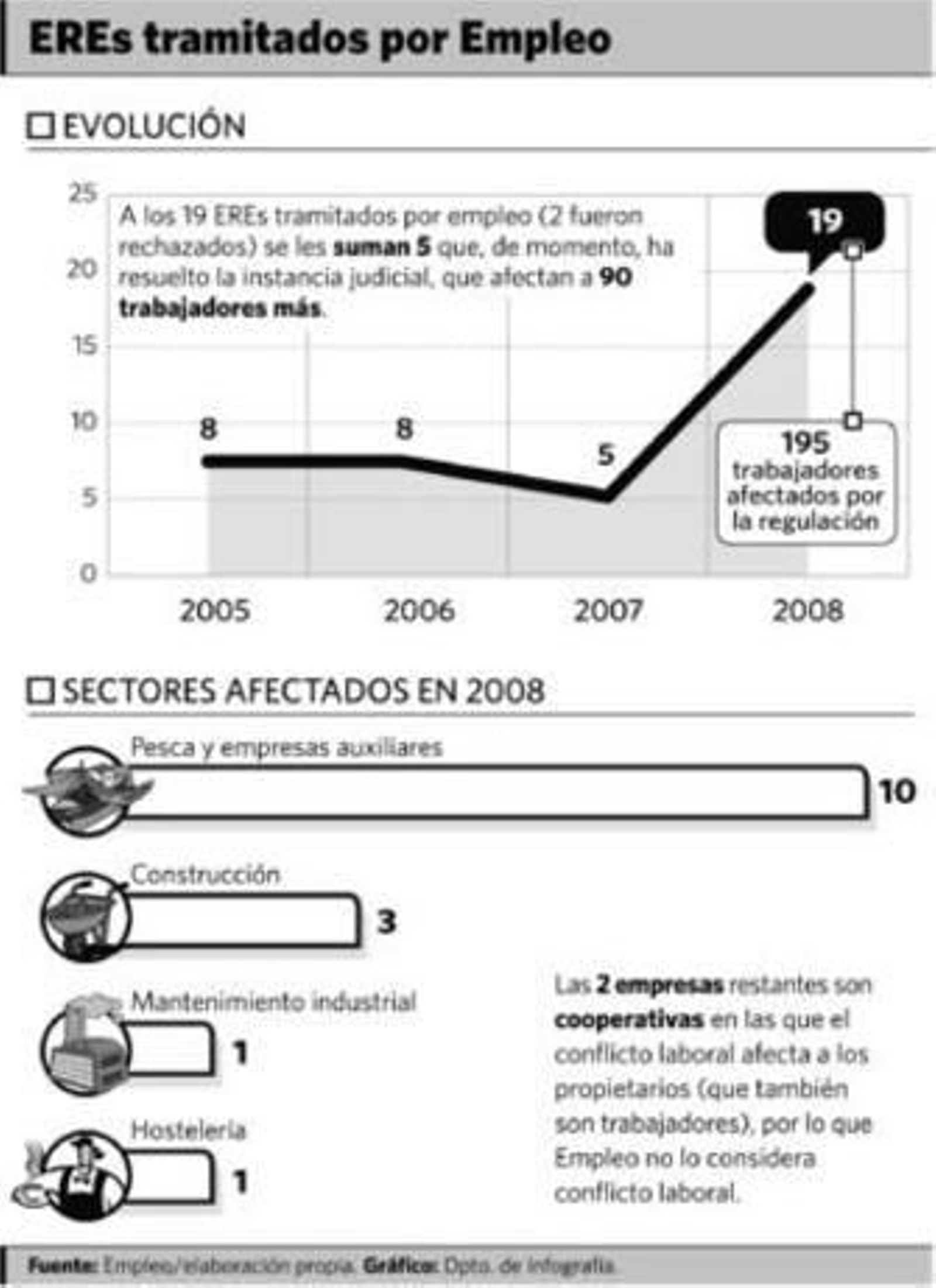 En el caso de las empresas, la mayor parte de las 'suspensiones de pagos' ha llegado de la mano de firmas de la construcción o de aquéllas que dependen directamente del sector (escayolistas, fontanerías, etc.). Así, de las 30 empresas afectadas, 27 pertenecen a este campo, dos a la pesca y sus servicios auxiliares y una a la fabricación de calzado. De momento se han resuelto cinco casos, que han terminado con Expedientes de Regulación de Empleo para cerca de 90 trabajadores.