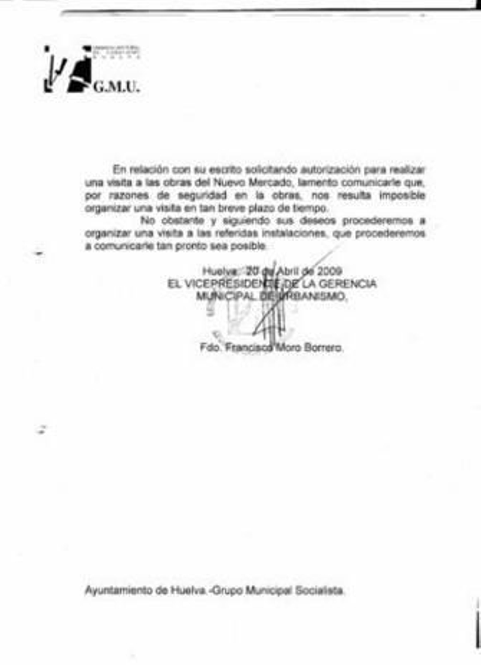 Mientras, en la orilla del PP dijeron ayer que Benabat no había dado tregua ninguna a que se respondiera debidamente la carta que el PSOE remitió al concejal de Comercio, Juan Carlos Adame, y que según parece, como la falsa moneda fue de mano en mano al derivarse a la Gerencia de Urbanismo, donde sí había previsión de organizar esta especie de mini-jornadas de puertas abiertas, pero con otro margen de reacción, "no de un día para otro". Al comprobar que los socialistas ya tenían concertada y fechada su performance ante la prensa, Francisco Moro salió ayer a la palestra para tratar de sofocar la polémica advirtiendo de que el PSOE "sólo intenta crear incertidumbre sobre una obra que dotará a la ciudad del mejor mercado de abastos de Andalucía". El concejal de Urbanismo aseguró que "en ningún momento" el equipo de Gobierno denegó a la oposición la posibilidad de realizar una visita a las obras del edificio: "Todo lo contrario, incluso nos hemos comprometido a organizar una visita a las instalaciones tan pronto como sea posible" ya que al solicitarlo en tan breve plazo de tiempo, "la protección de su seguridad, para adoptar las medidas oportunas en la obra, nos ha resultado imposible organizarla para el día de hoy [argumento que la Gerencia apoyó ayer en el certificado reproducido en esta página]".