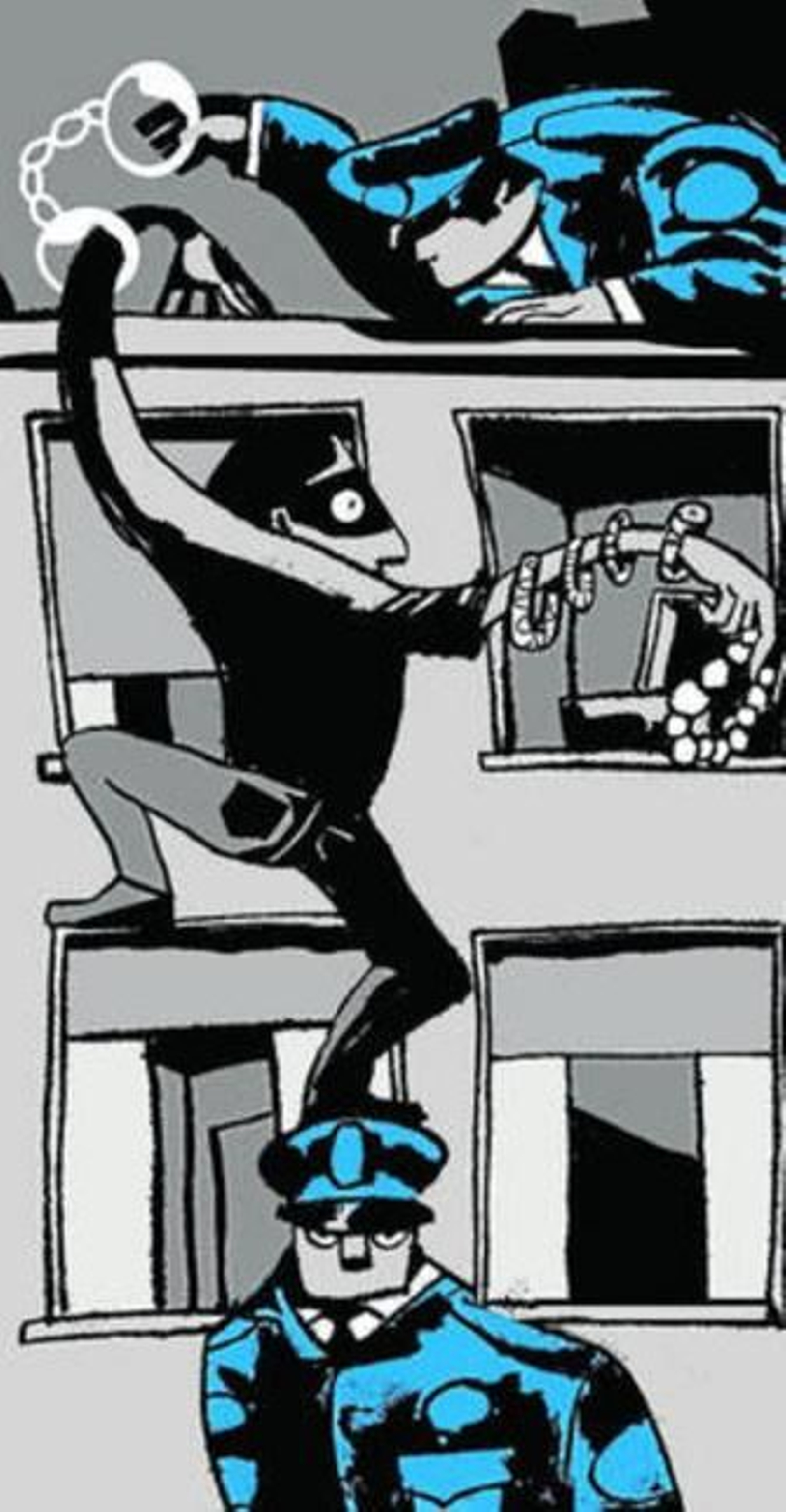 Quizá también la obra y el andamio contribuyan a explicar cómo un hombre de 53 años salte de ático en ático, trepe y descienda de un piso a otro con la misma facilidad (o más) que un veinteañero. El protagonista de este cómic de policías y ladrones es de complexión delgada, pura fibra de tanto brinco y ha dejado pasmado a más de una de sus víctimas y a algún policía por su habilidad física.
