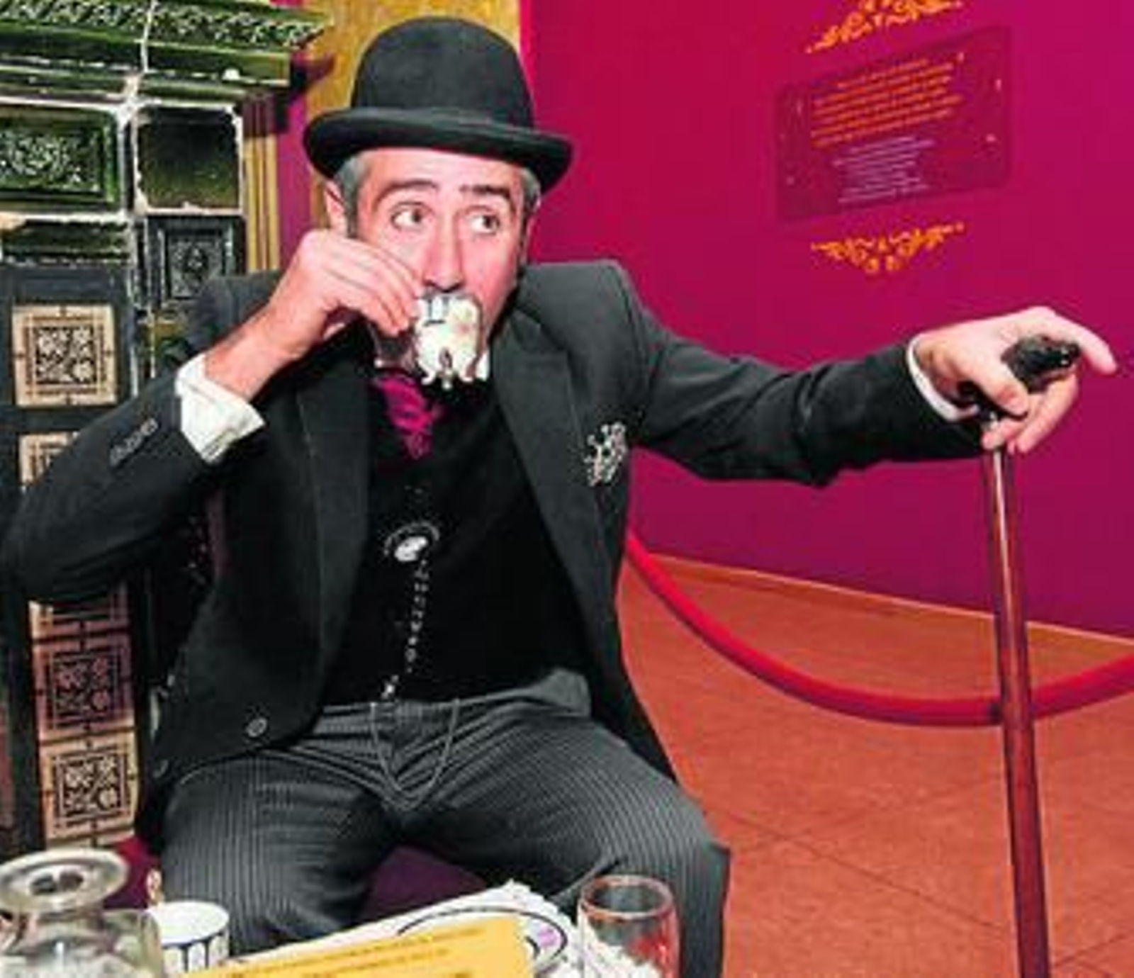 El guía turístico no duda en hacer una parada para tomarse un te, cumpliendo así con una costumbre muy inglesa, mientras los visitantes se recrean con los objetos expuestos en las vitrinas. Entre ellos, parte de una de las vajillas en las que se sirvieron los agapés en la celebración del IV centenario del descubrimiento de América en el Hotel Colón, piezas decoradas en rosa y en azul, elaboradas en Sajonia. El salón de celebraciones, decorado por el artista Antonio Matarredona, fue demolido en el año 1991.